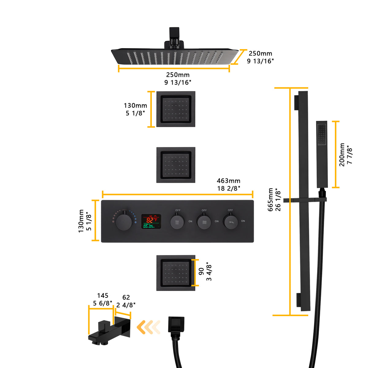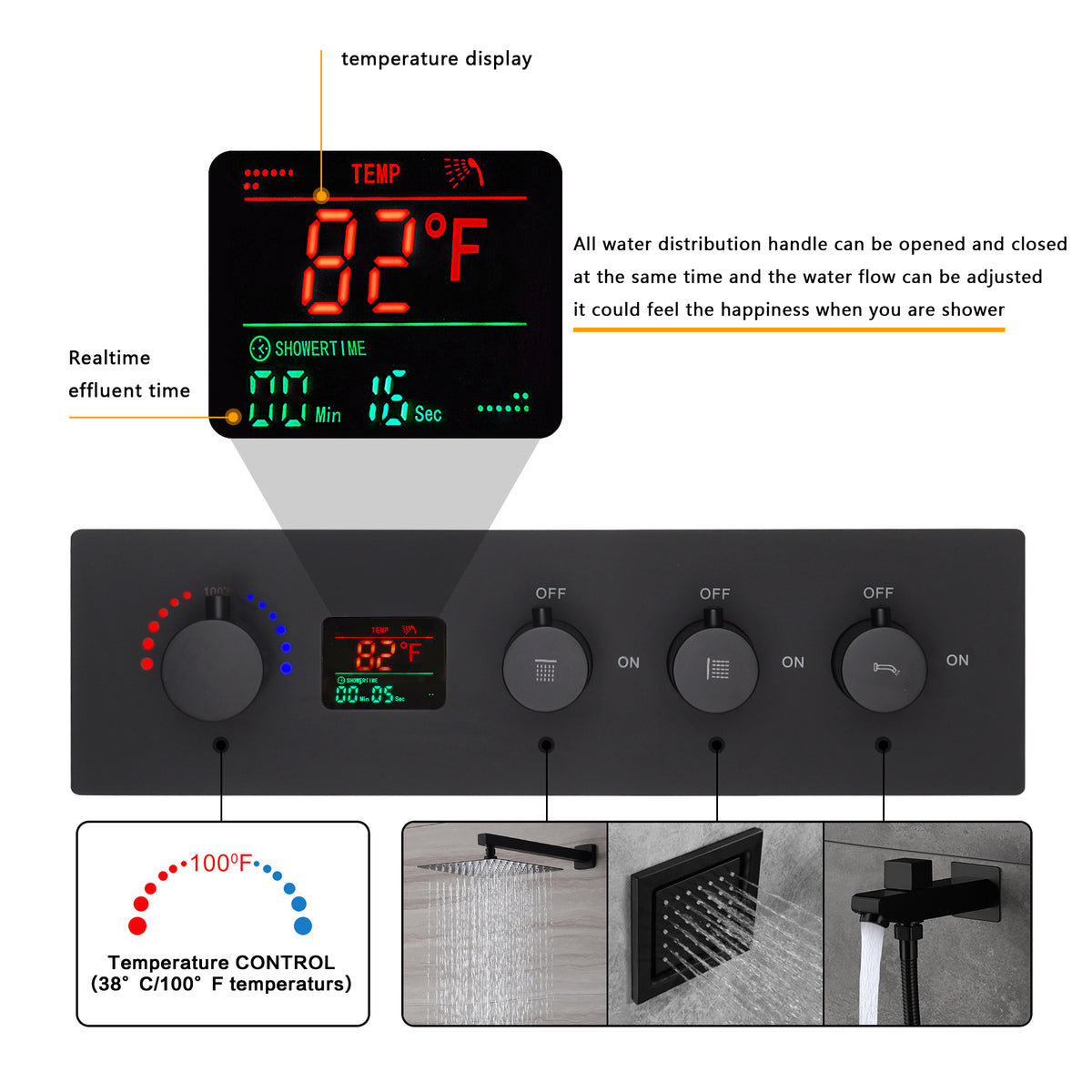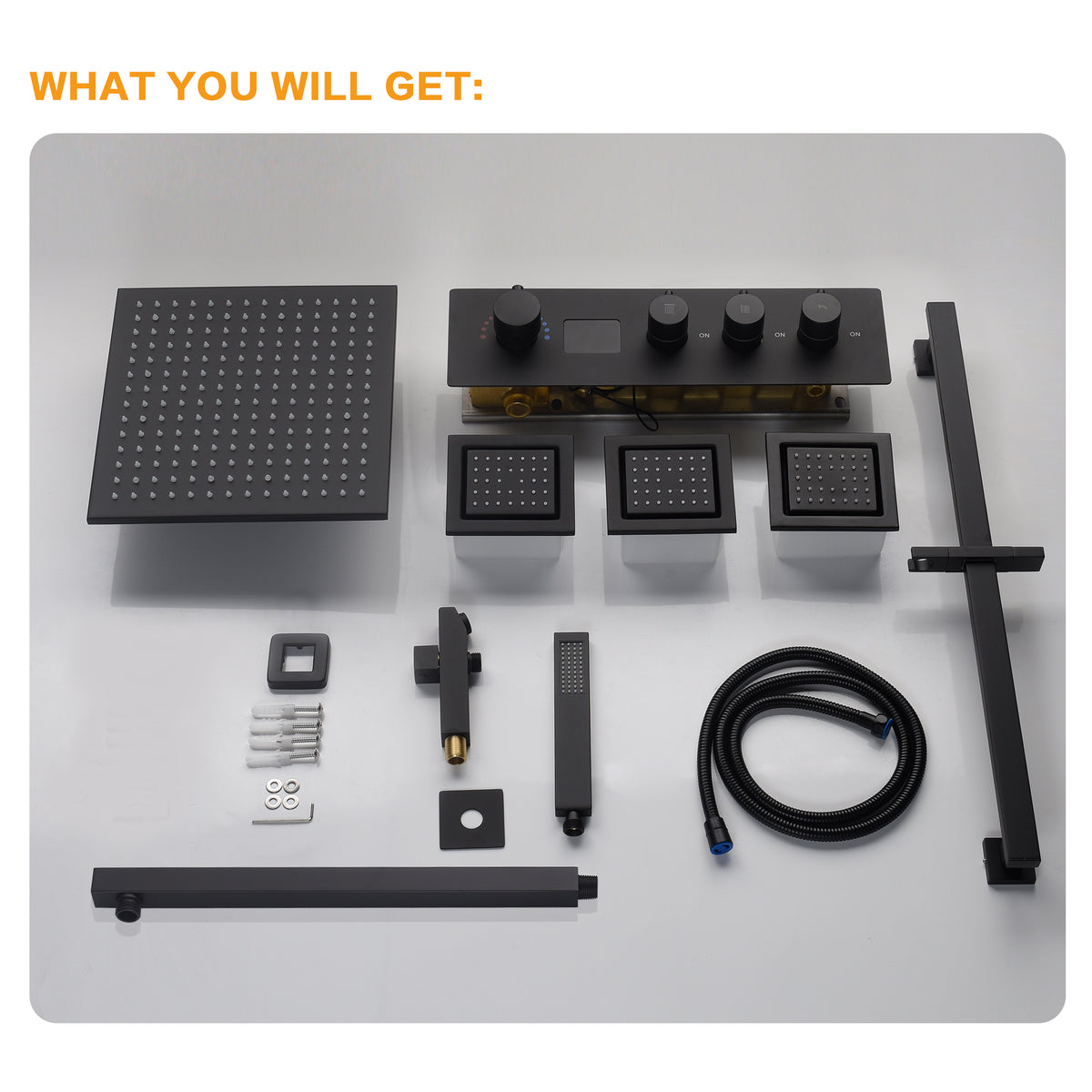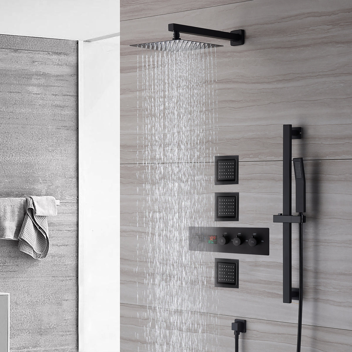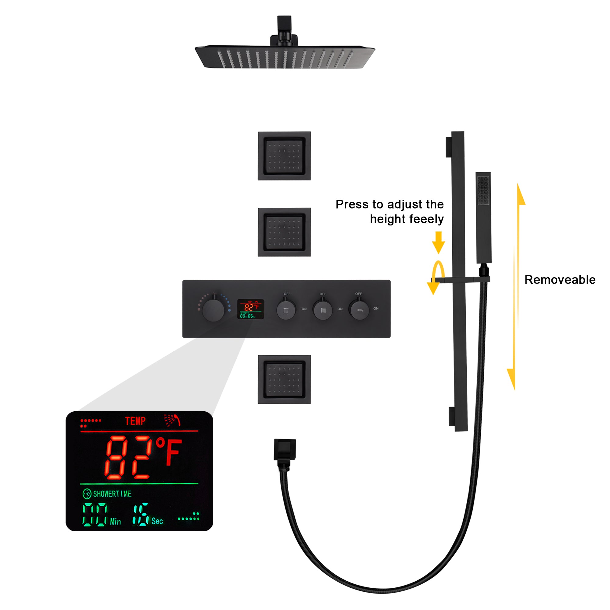 wall mount 12 inch or 16 inch matt black 3 way digital thermostatic shower faucet with sliding bar and 4inch body jets