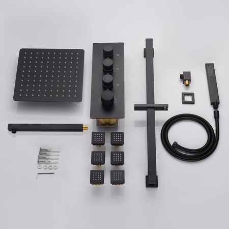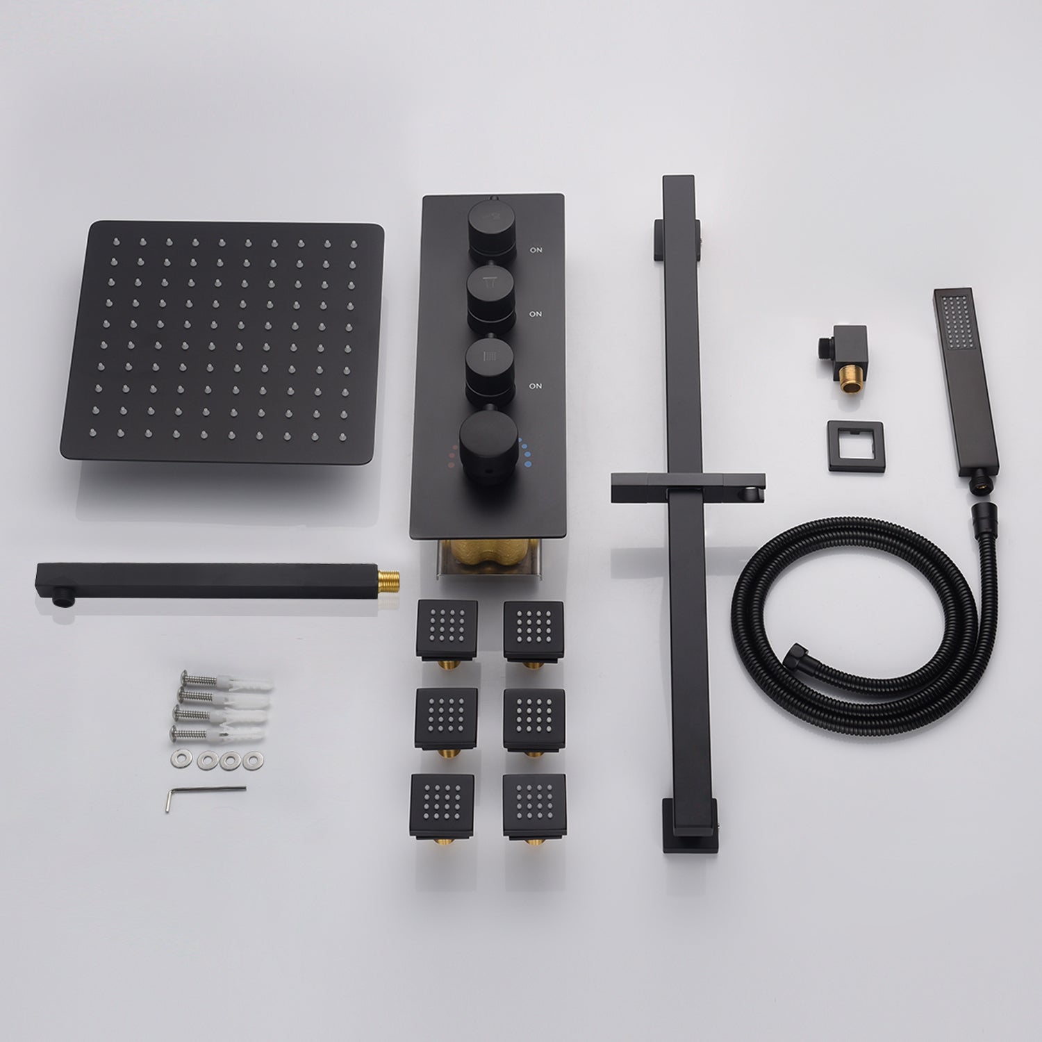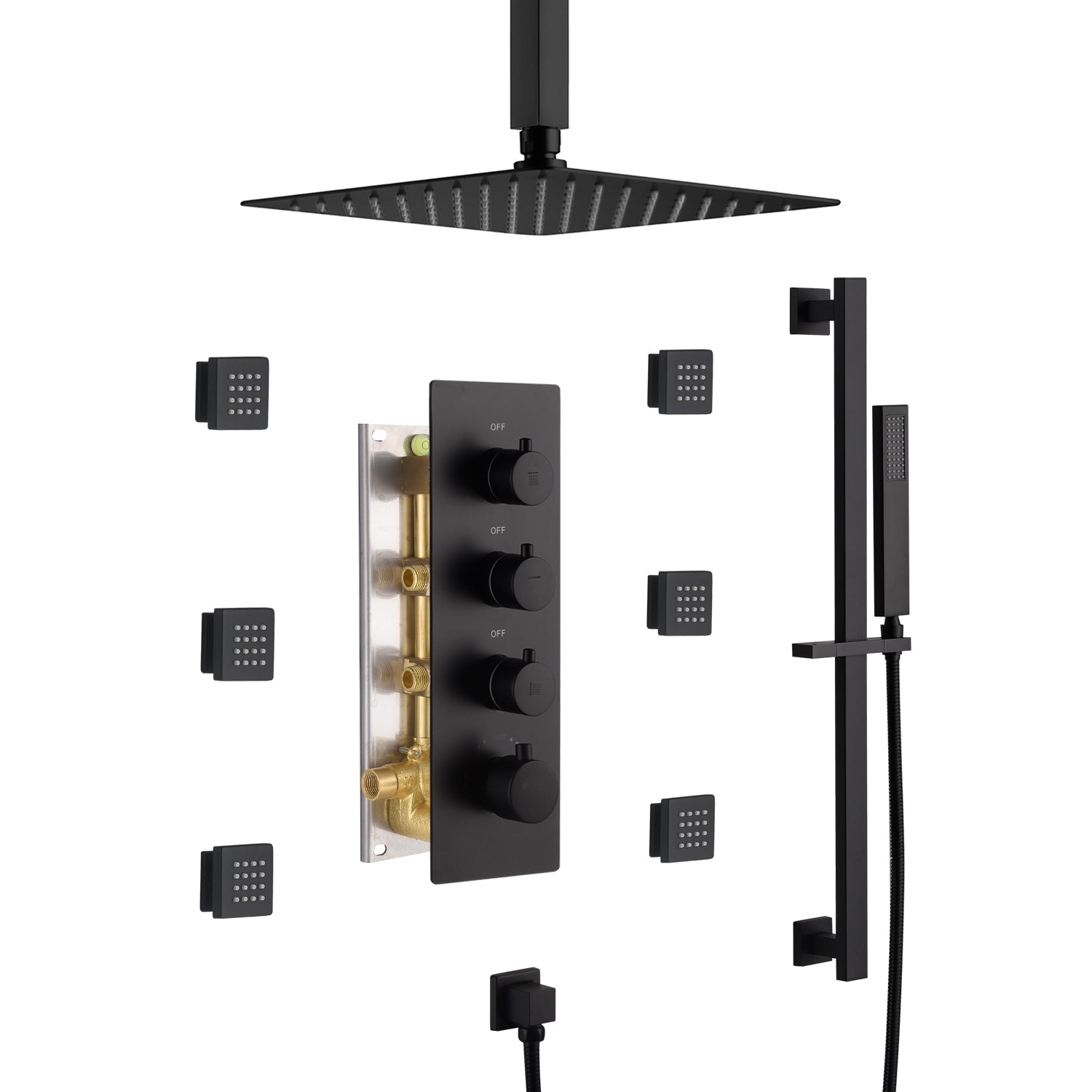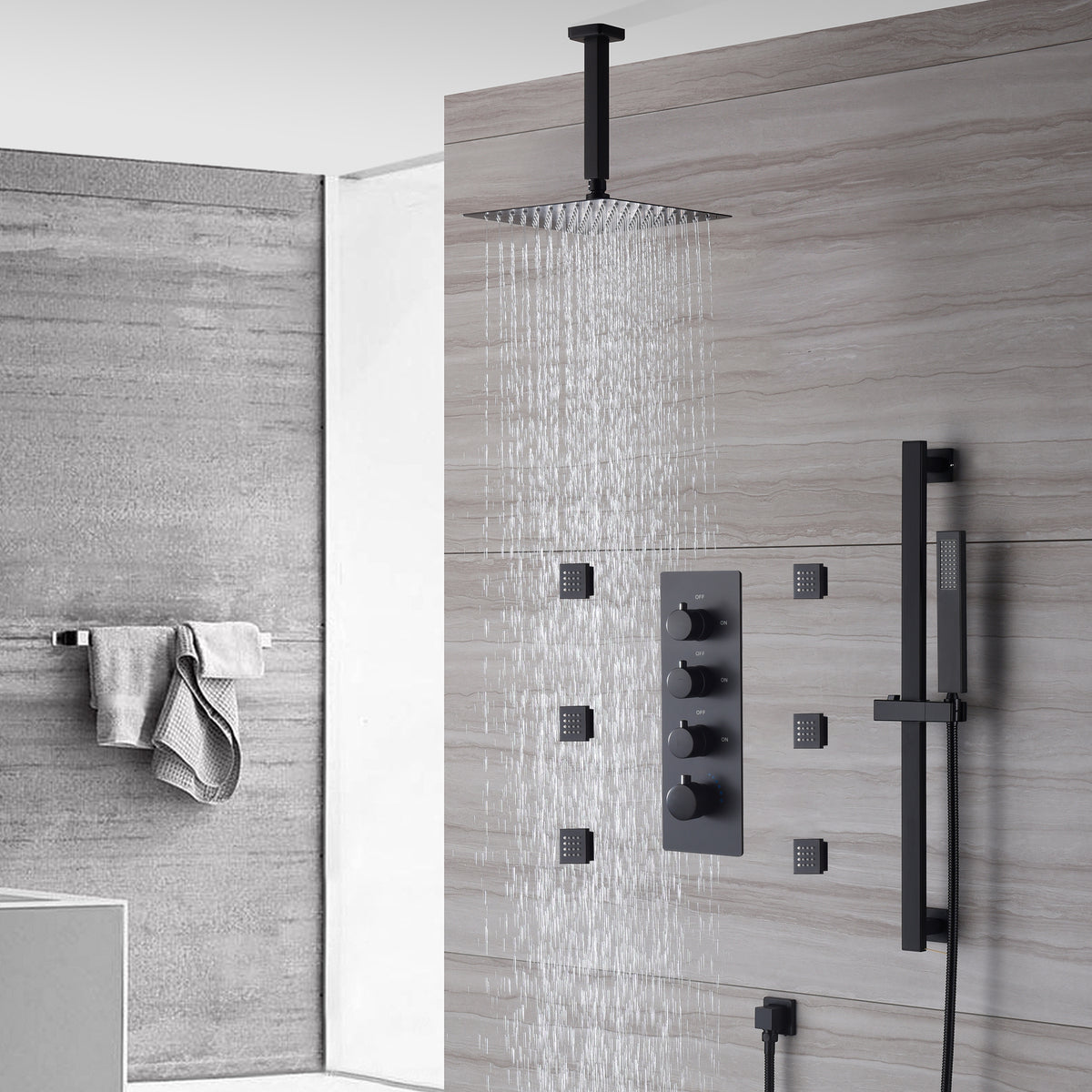 12 inch or 16 inch Ceiling mounted shower head matte black 3 way thermostatic shower faucet with body jets and sliding bar