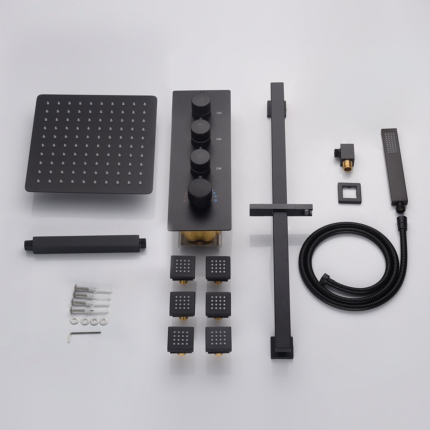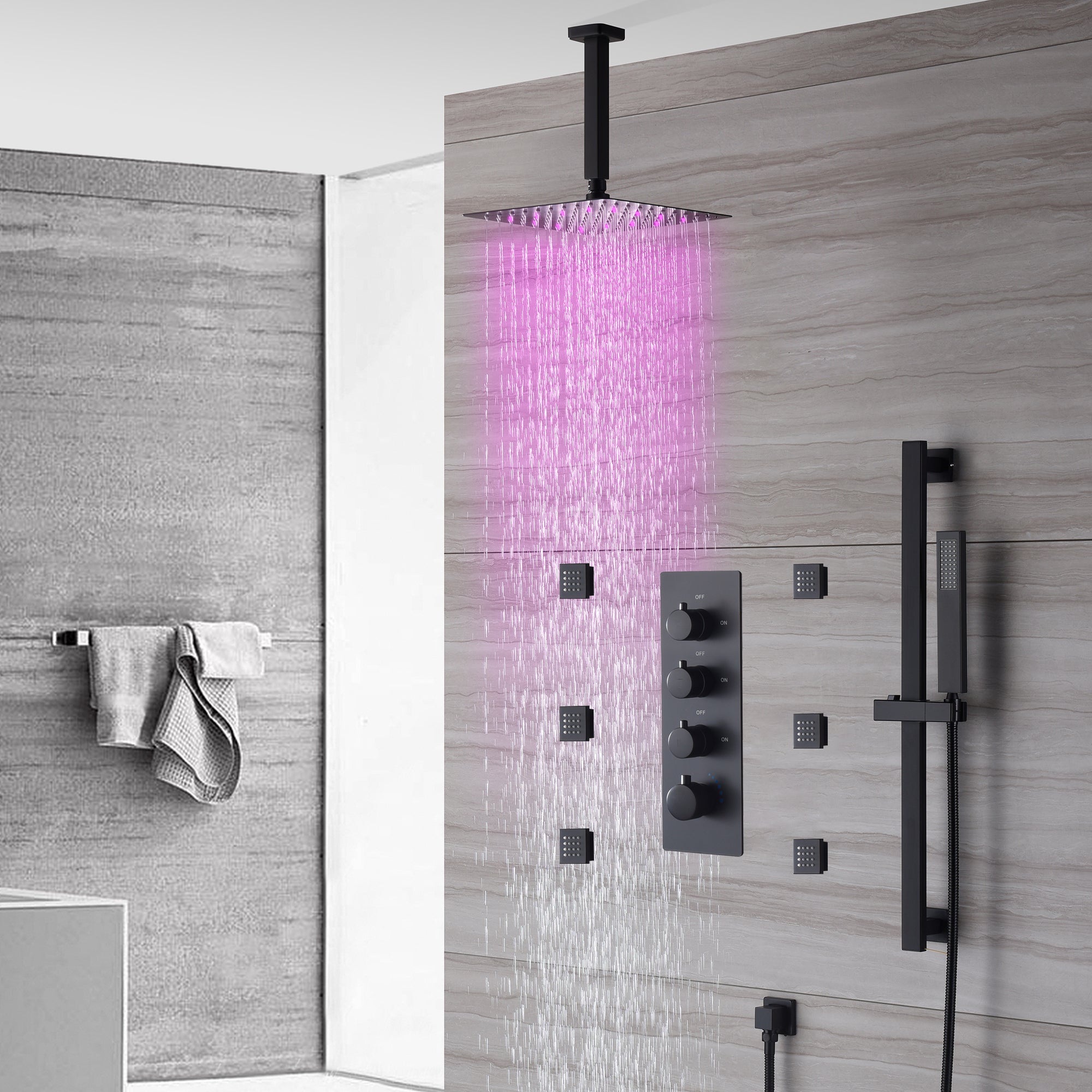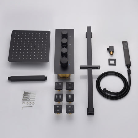 Ceiling mounted 12 inch LED or 16 inch LED shower head matte black 3 way thermostatic shower faucet with body jets and sliding bar