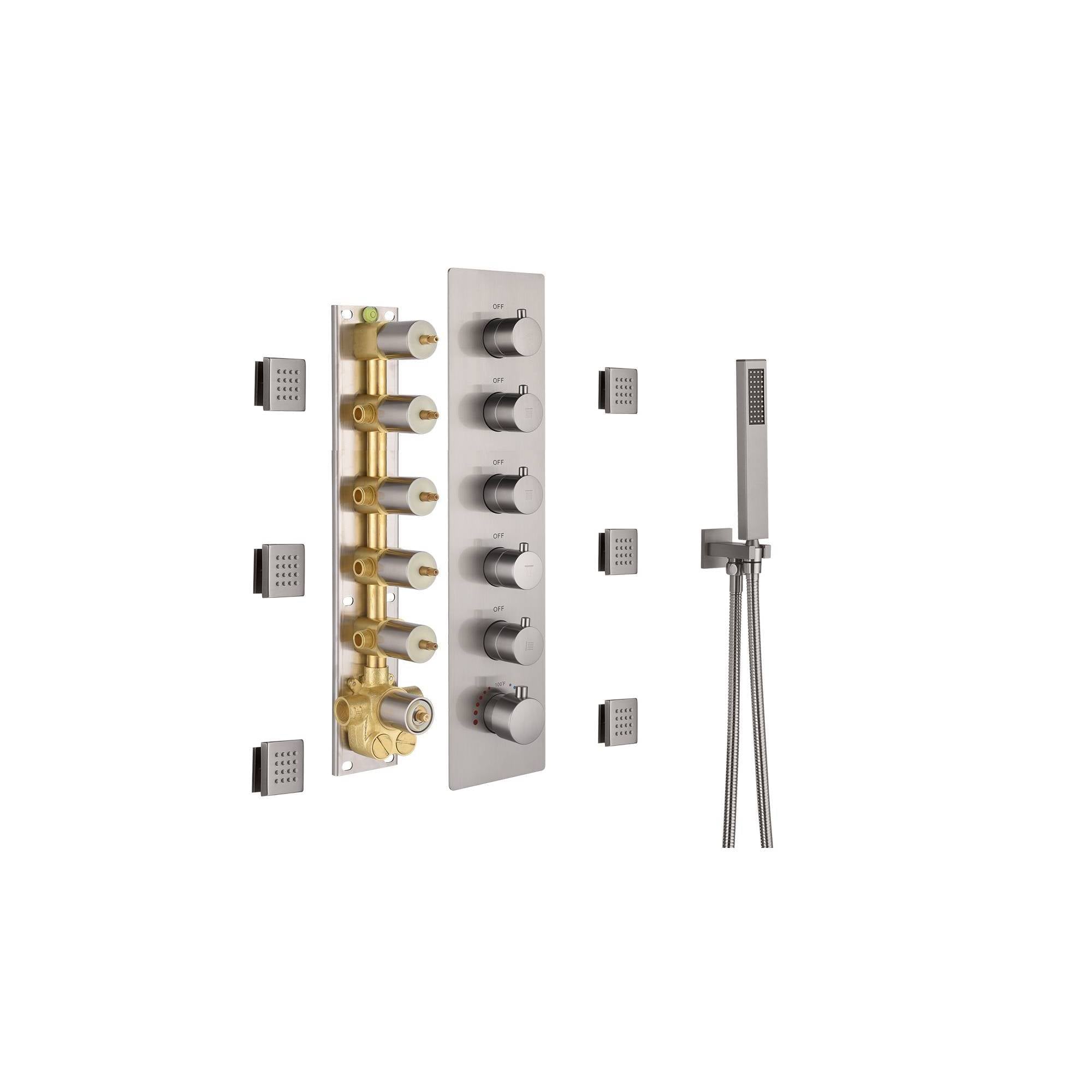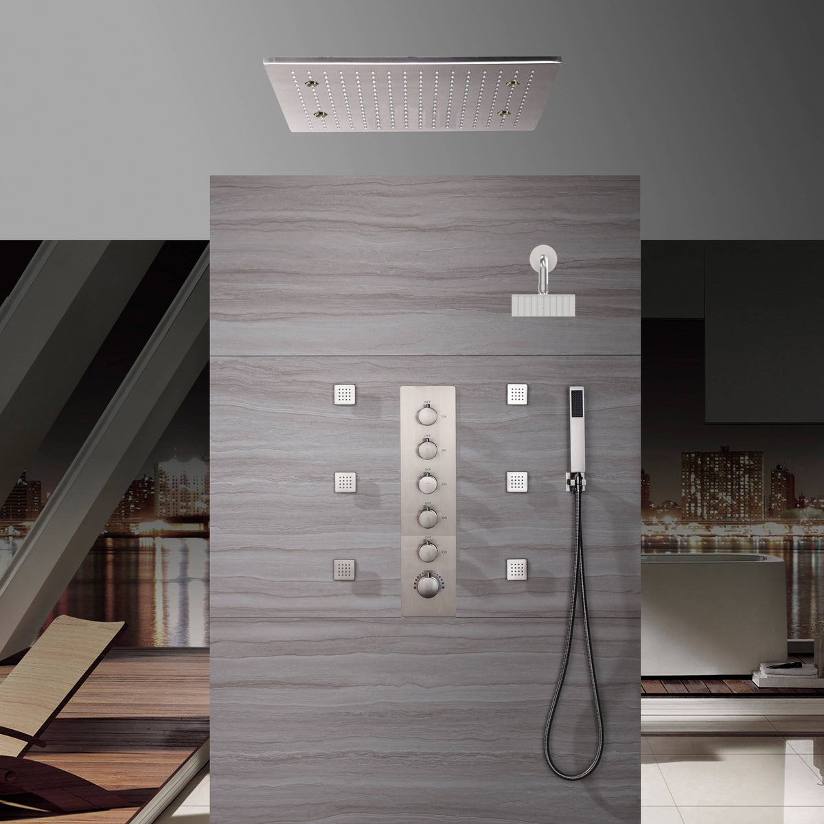 20 Inch Brushed nickel ceiling mount rainfall Mist shower systems 5 way thermostatic valve with 6 body jets and wall mount 6 inch regualr shower head
