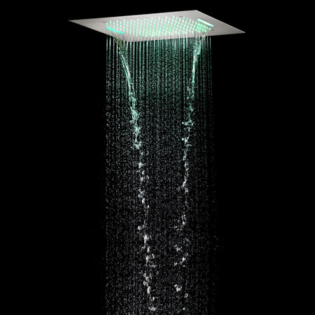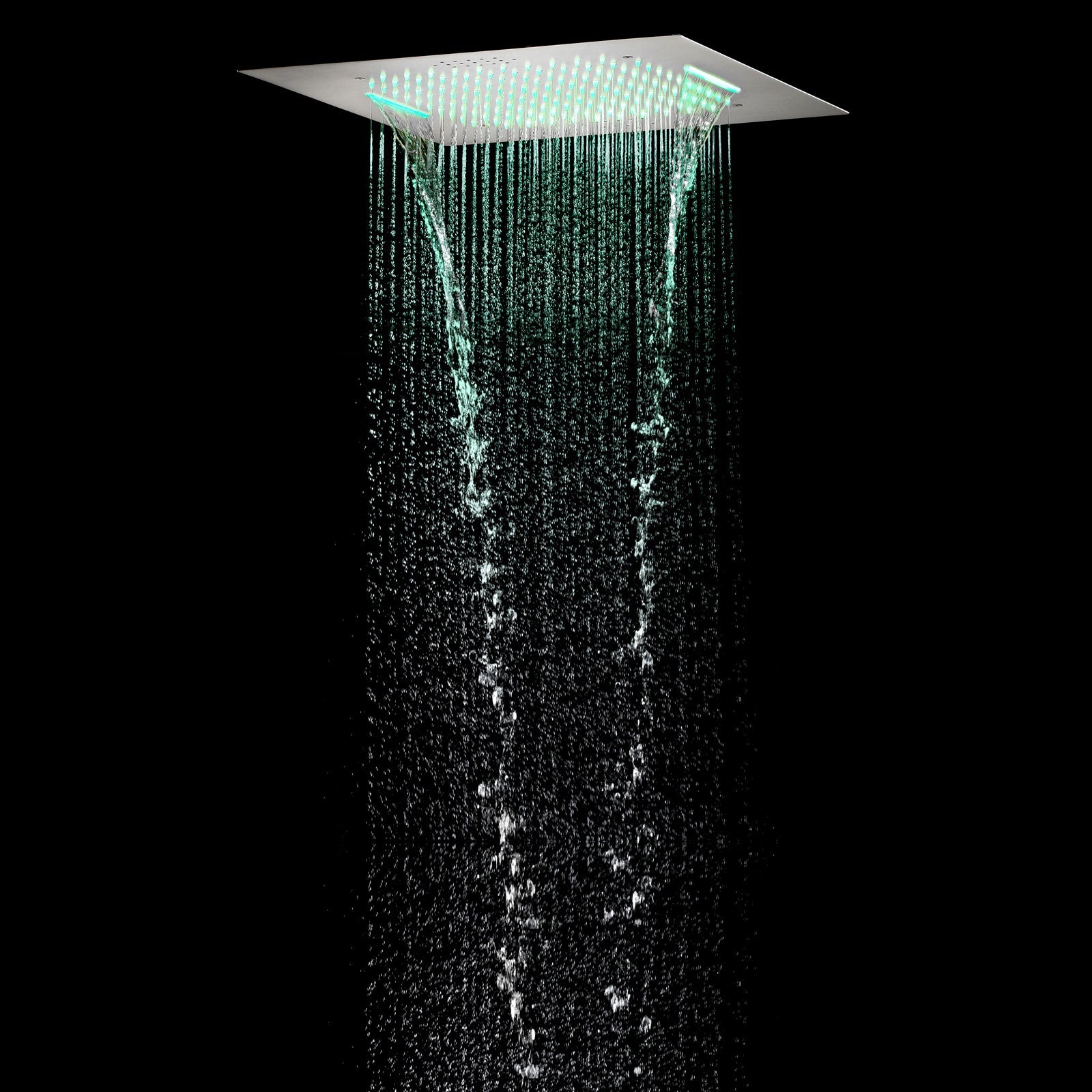 shower head size: 20 x 20 inch, rainfall waterfall, bluetooth speaker and 64 LED light