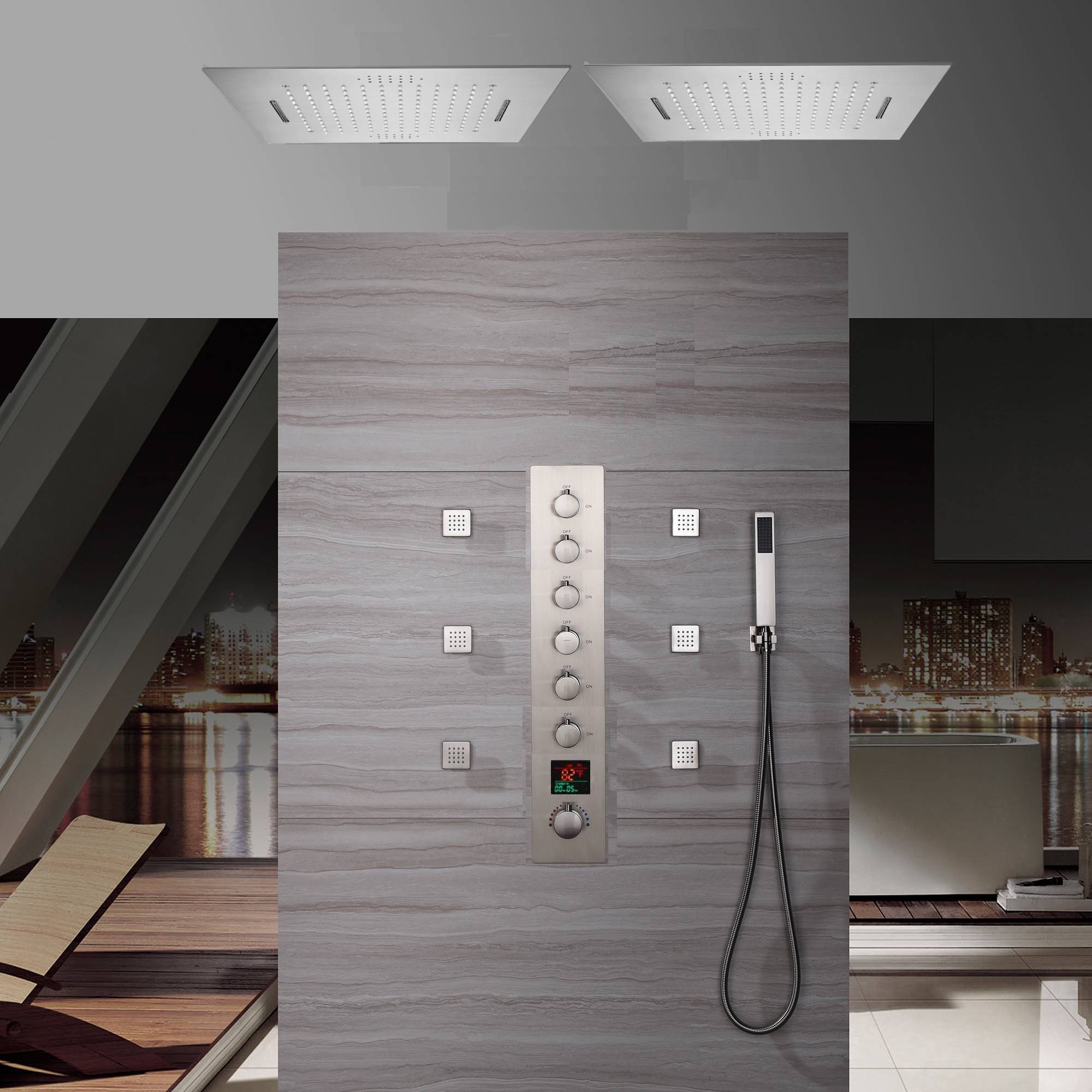 Dual 20 Inch Brushed nickel Flushed mount rainfall waterfall 64 LED light Bluetooth Music shower systems 6 way Digital display thermostatic valve with 6 body jets and regular head