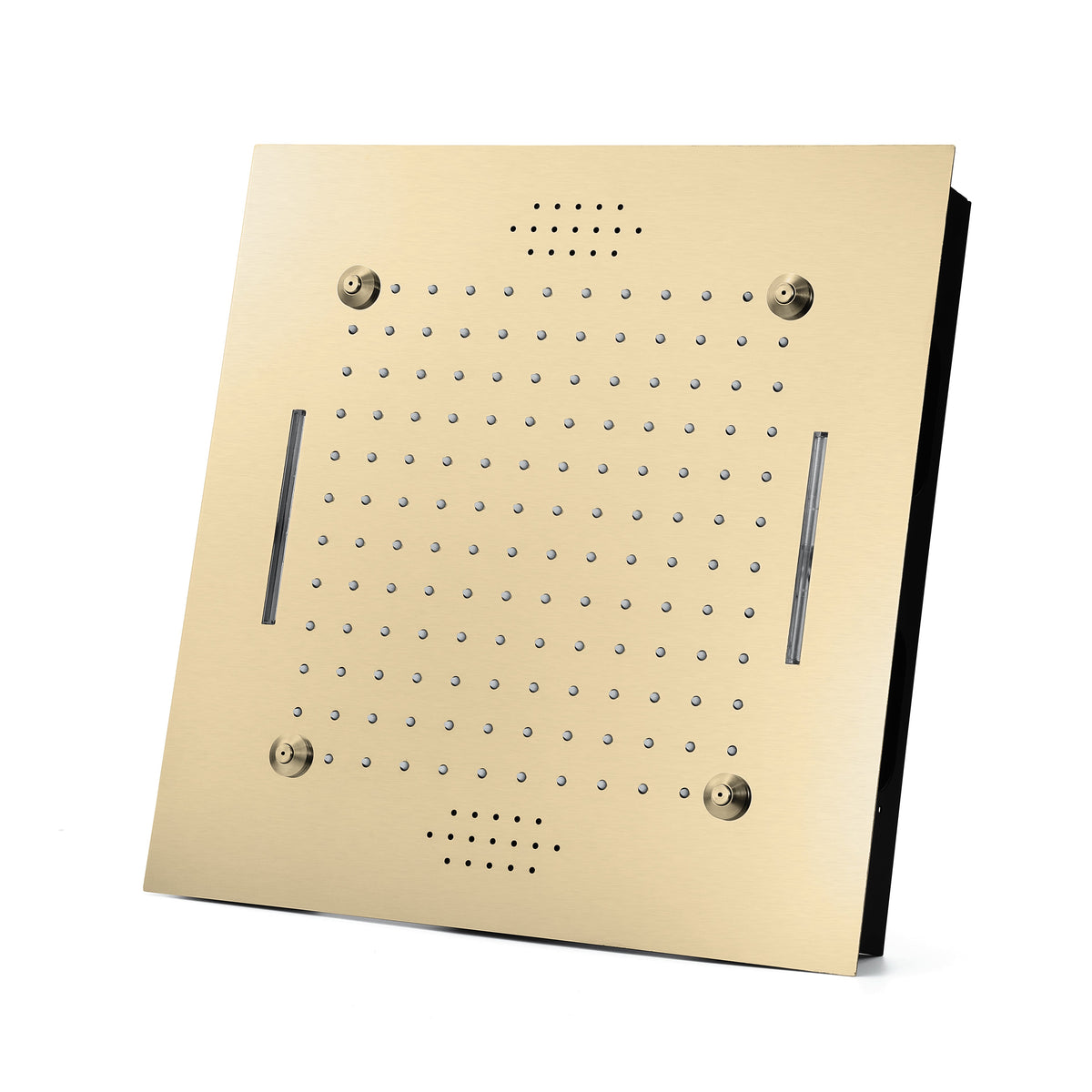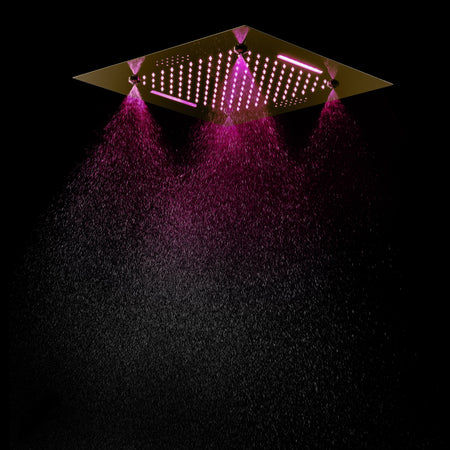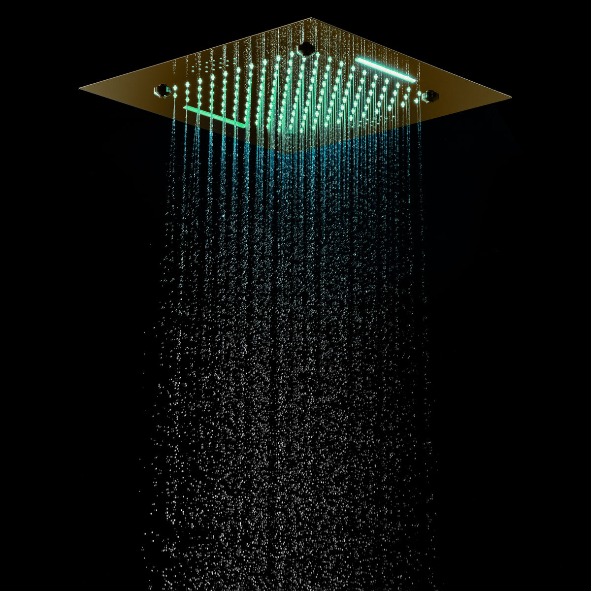 Brushed Gold 20 Inch Flushed Ceiling Mount Rainfall Waterfall Mist 64 LED Light Bluetooth Music Shower Head 6 Way Digital display Thermostatic Shower Faucet Set with Body Jets and regular head