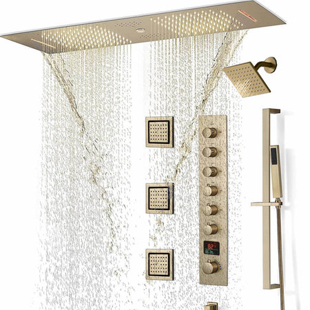 Brushed Gold 36 Inch Flushed Ceiling Mount Rainfall Waterfall Water Column 64 LED Light Bluetooth Music Shower Head 6 Way Digital display Thermostatic Shower Faucet Set with Body Jets and Touch Panel