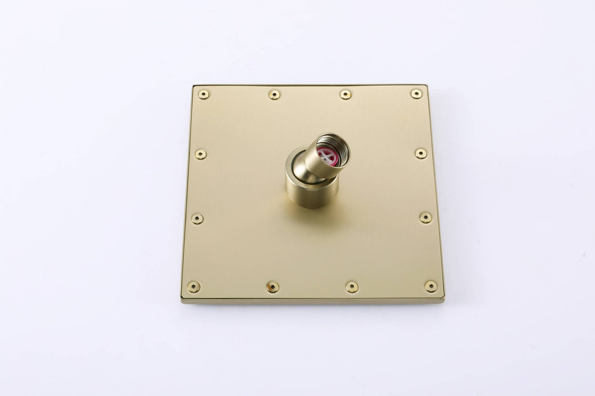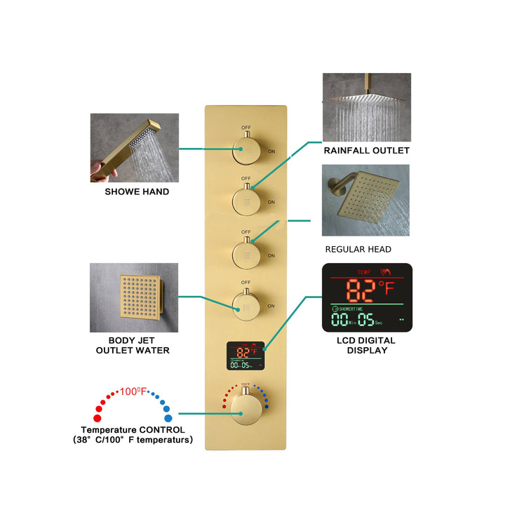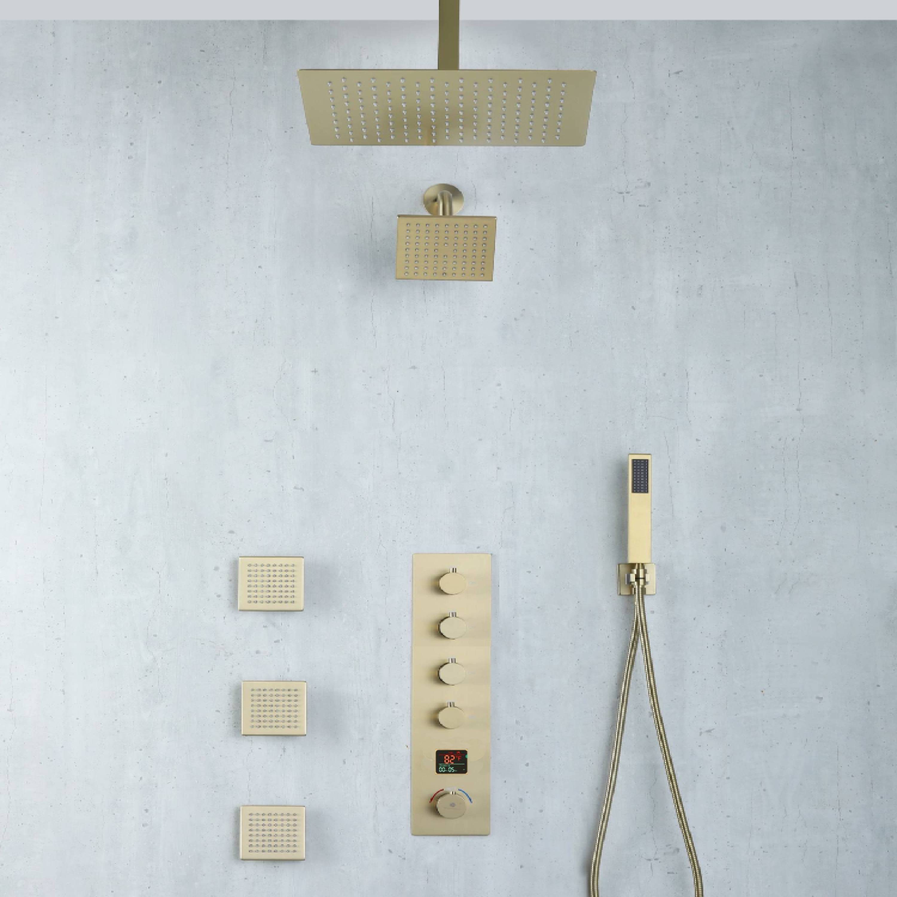Brushed Gold 4 Function digital display Thermostatic Faucet Set with Ceiling 12" or 16'' Rain Shower Head, High Pressure 6", Body Jets and Handheld Spray