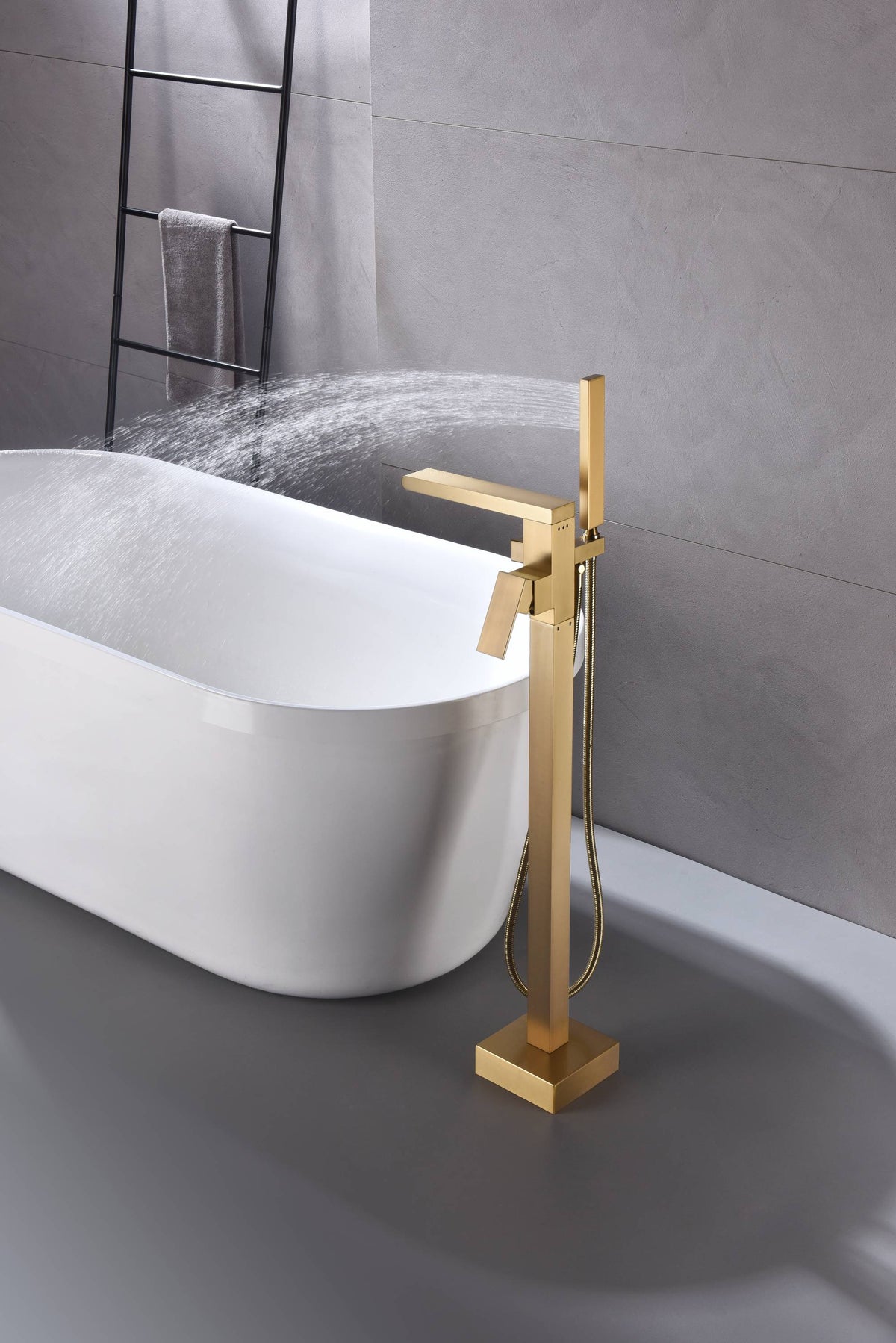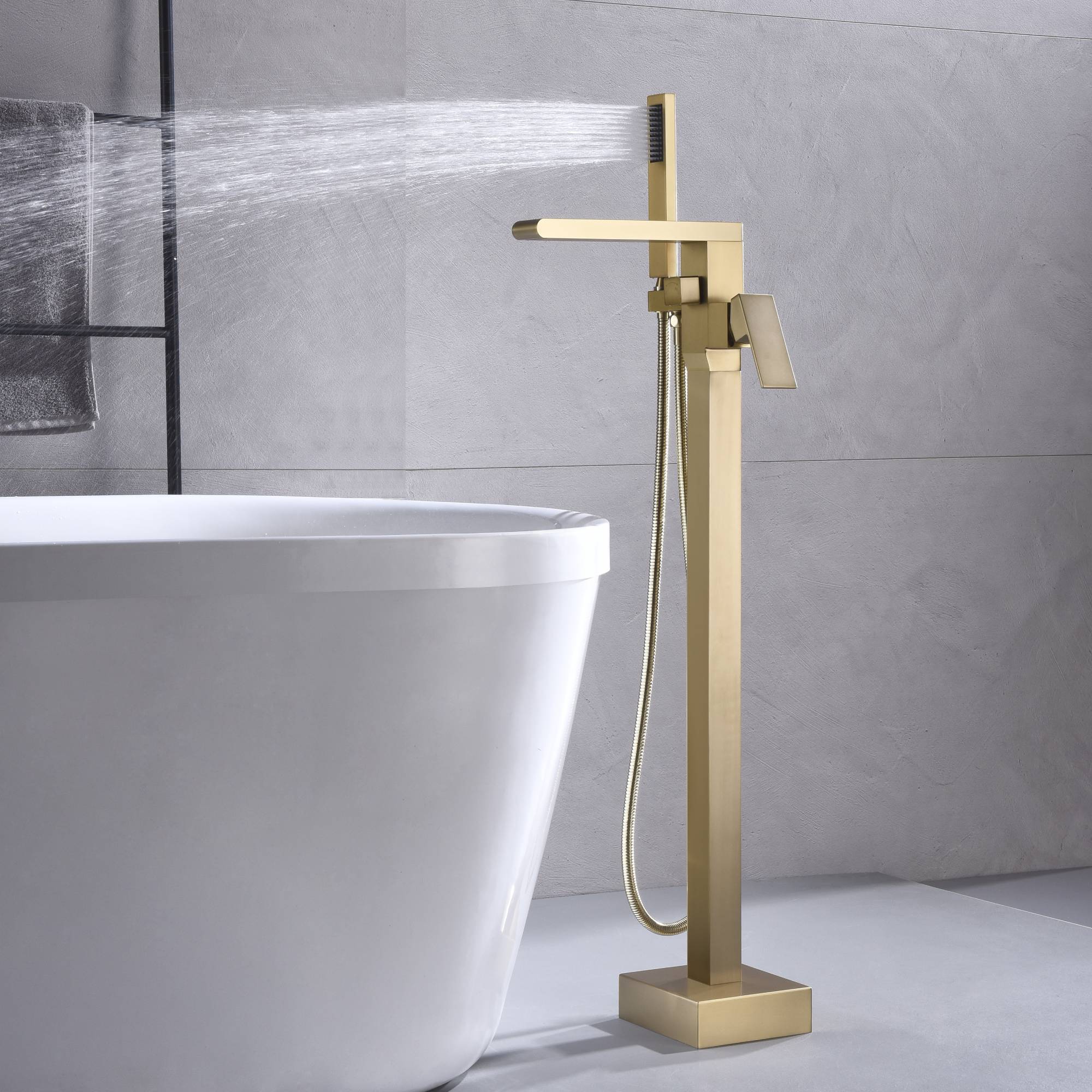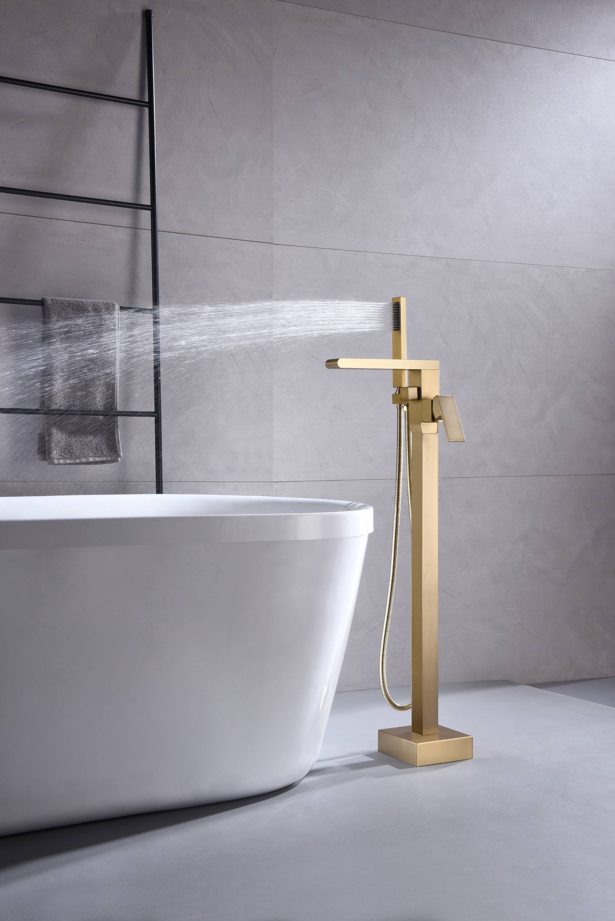 Waterfall Brushed Gold Finish Pressure Balance Single Handle Floor Mount Freestanding Tub Filler Faucet with Hand Shower