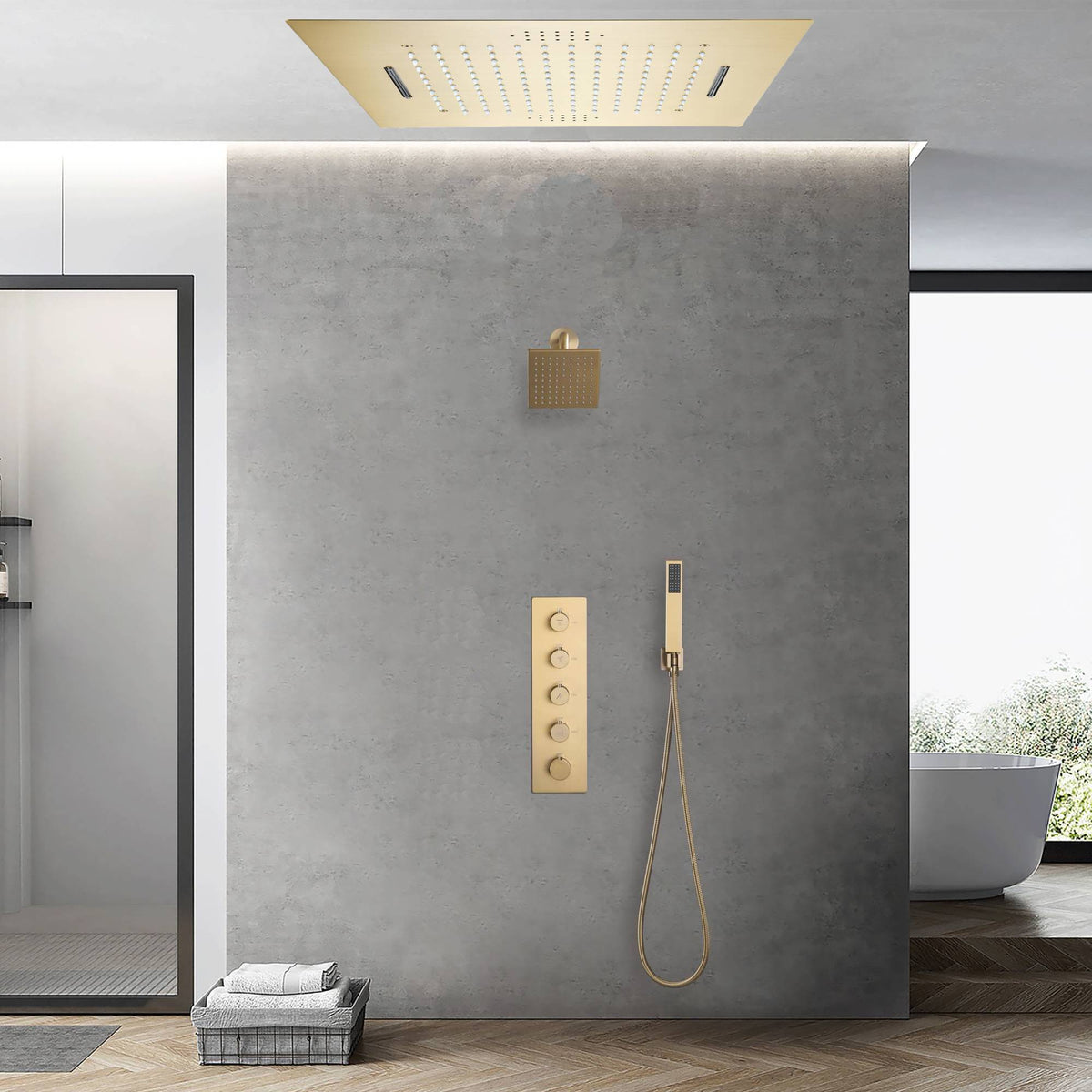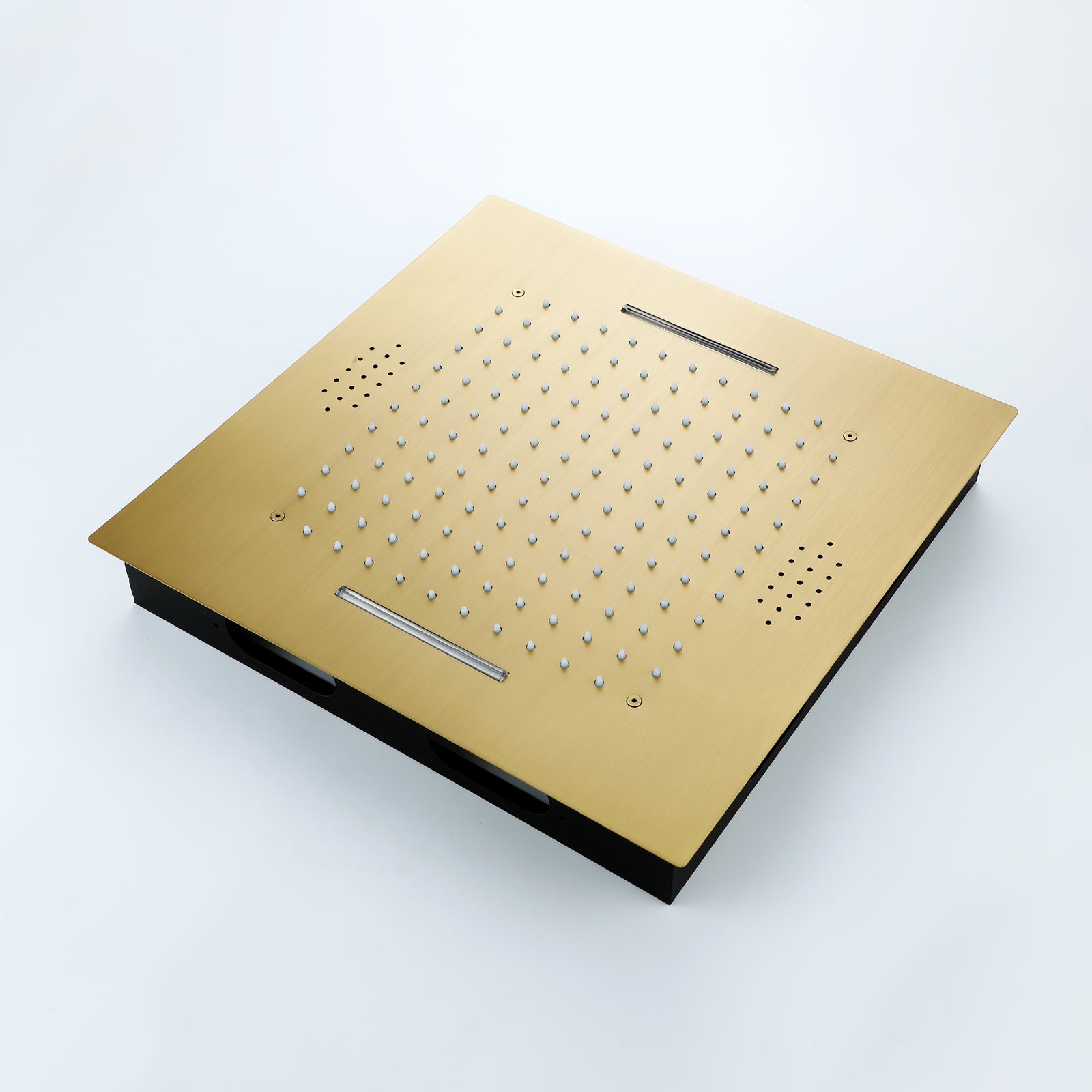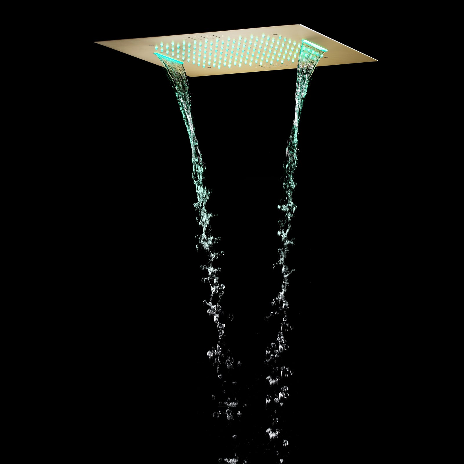 Brushed gold flush mounted 20 inch rainfall Waterfall 64 LED light Bluetooth Music shower head 4 way digital display shower faucet with regular head