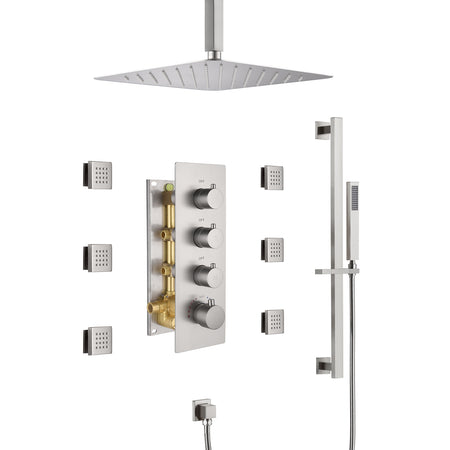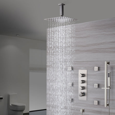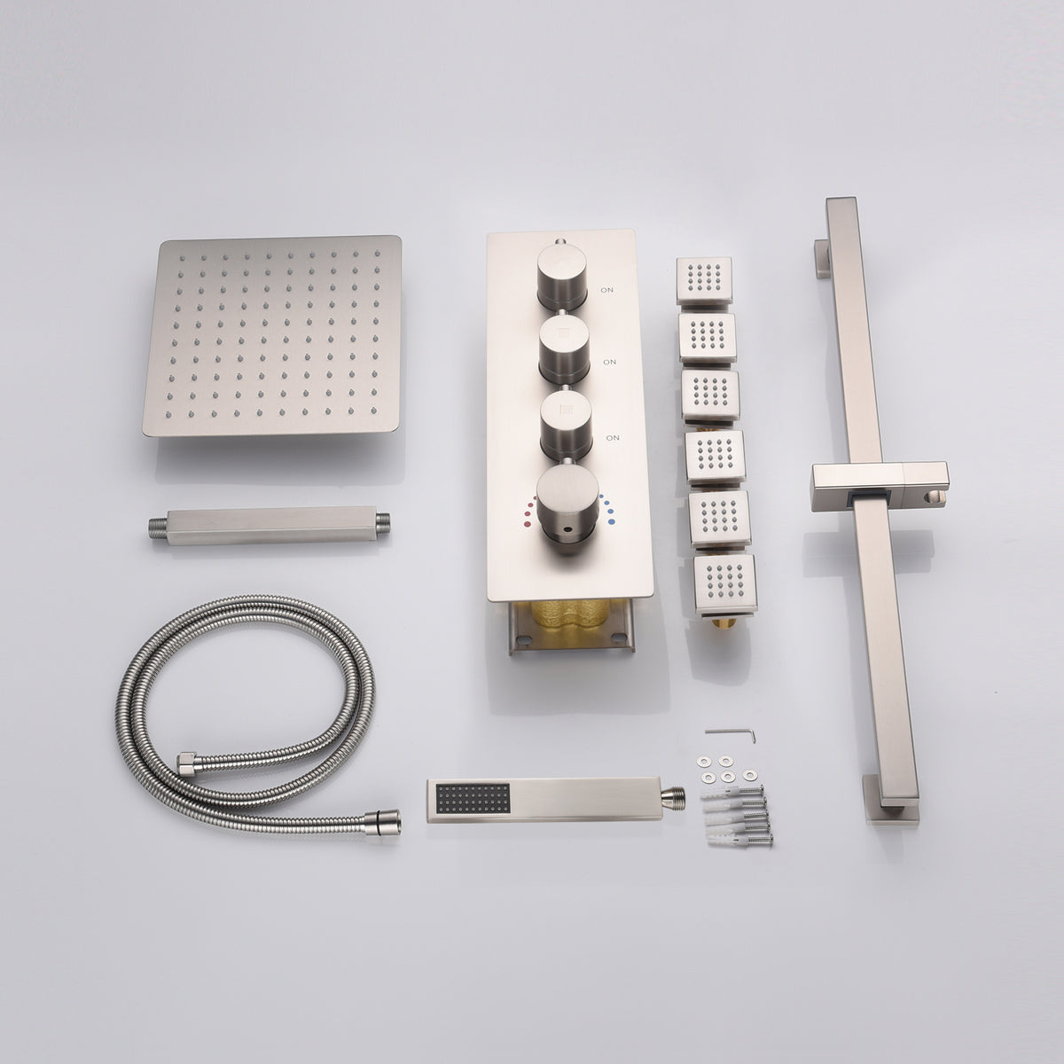 Brushed nickel 12 inch or 16 inch Ceiling mount Rain Shower system with 6 body jets and 3 way Thermostatic valve that each function work all together and separately