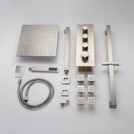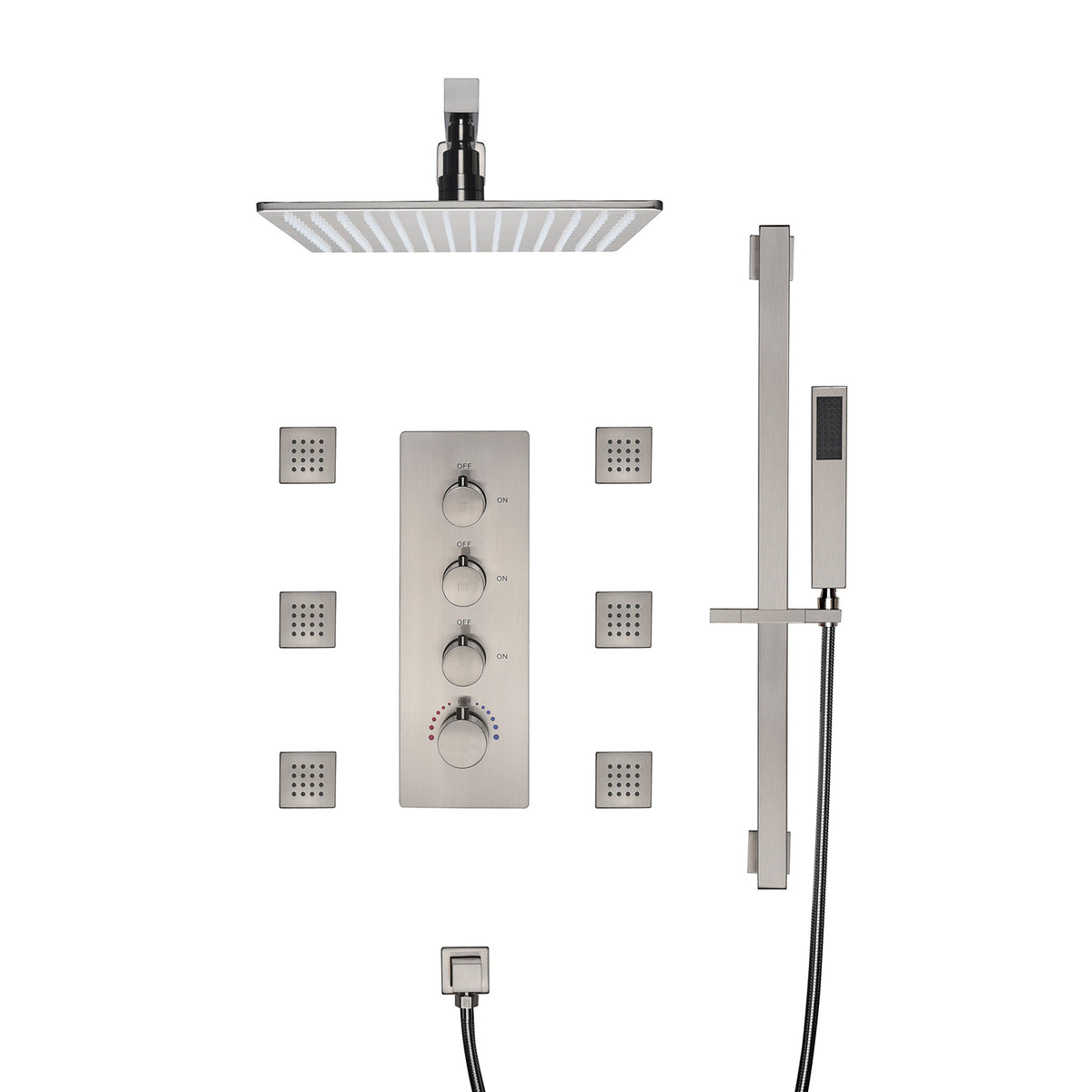 Brushed nickel 12 inch or 16 inch wall mount Rain Shower system with 6 body jets and 3 way Thermostatic valve that each function work all together and separately