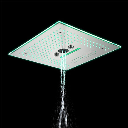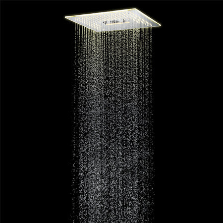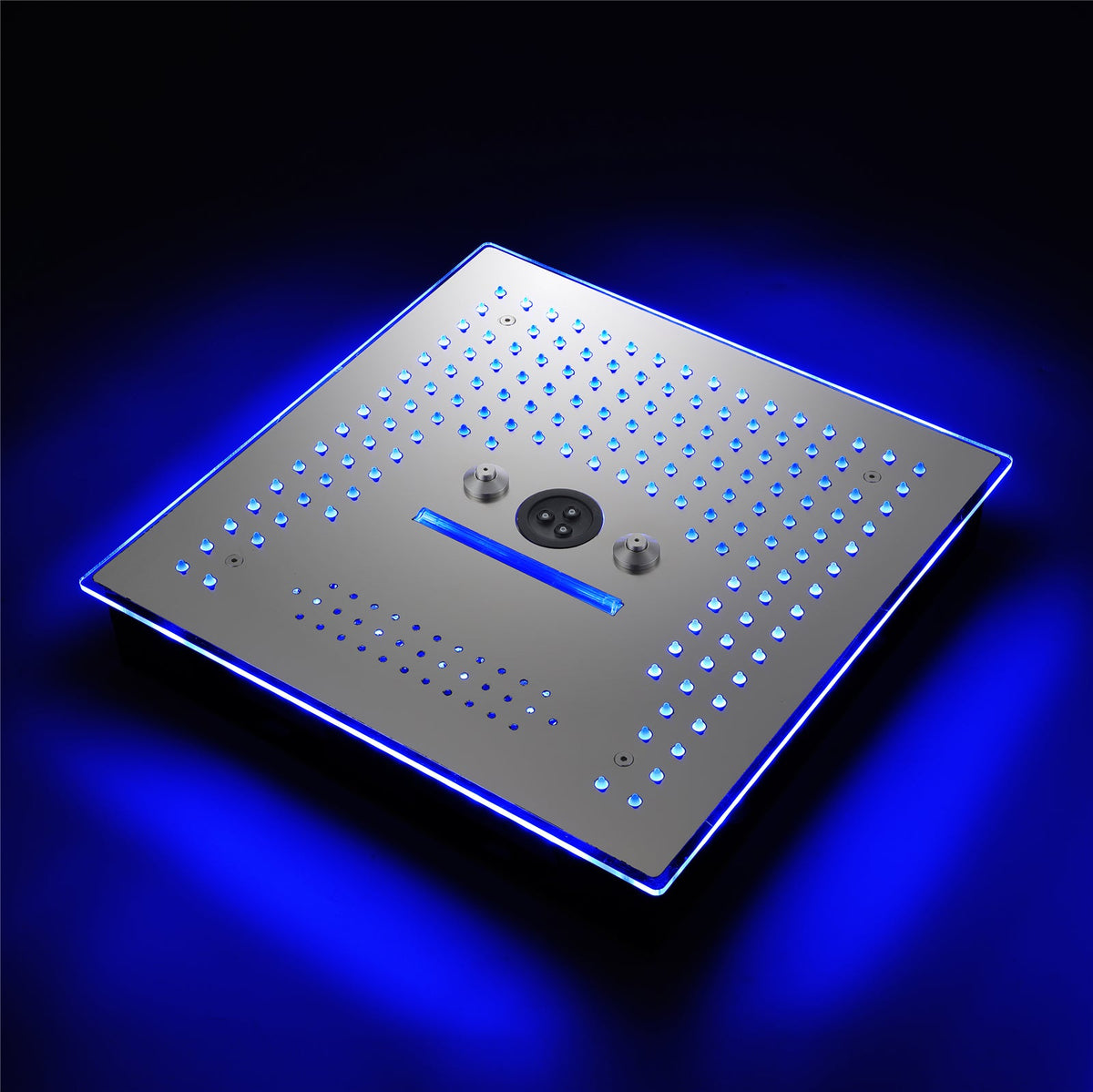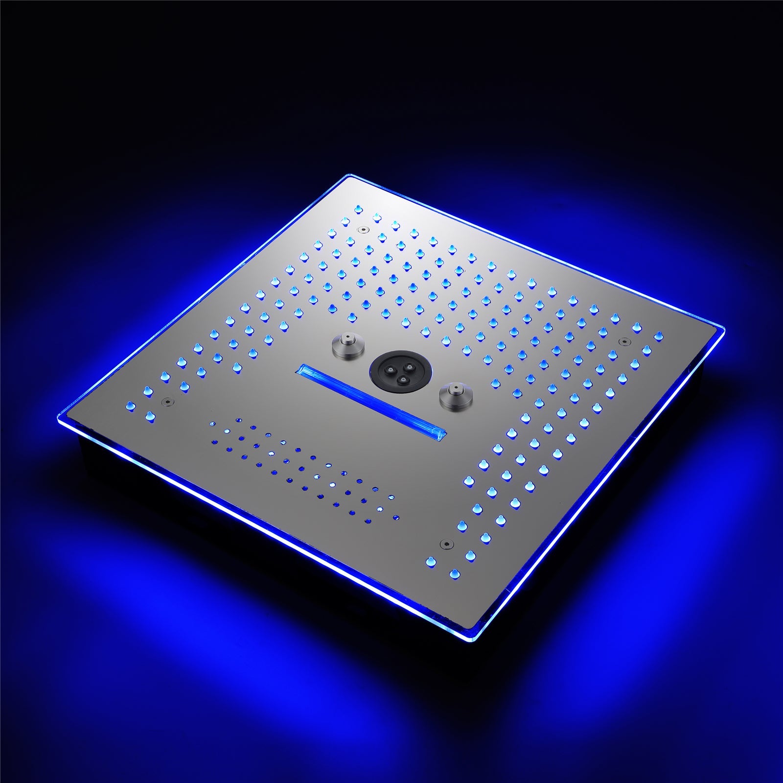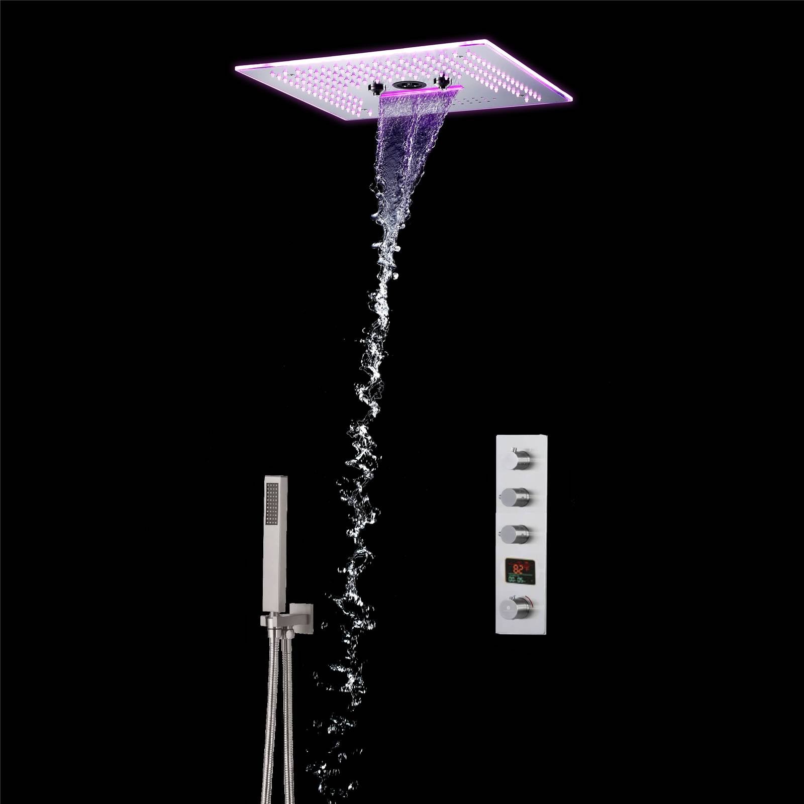 Brushed nickel 16'' x 16'' music 64 LED light rainfall waterfall mist 360 Degrees rotating hydro jet stainless shower head flushed mounted 3 way digital thermostatic shower system