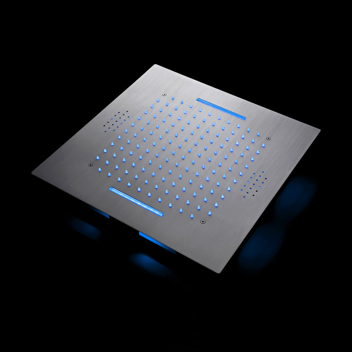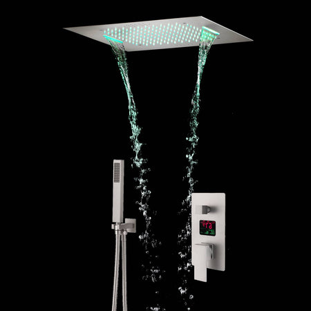 Brushed nickel 20 inch flushed mount rainfall waterfall 64 LED light bluetooth music shower faucet system with handle shower