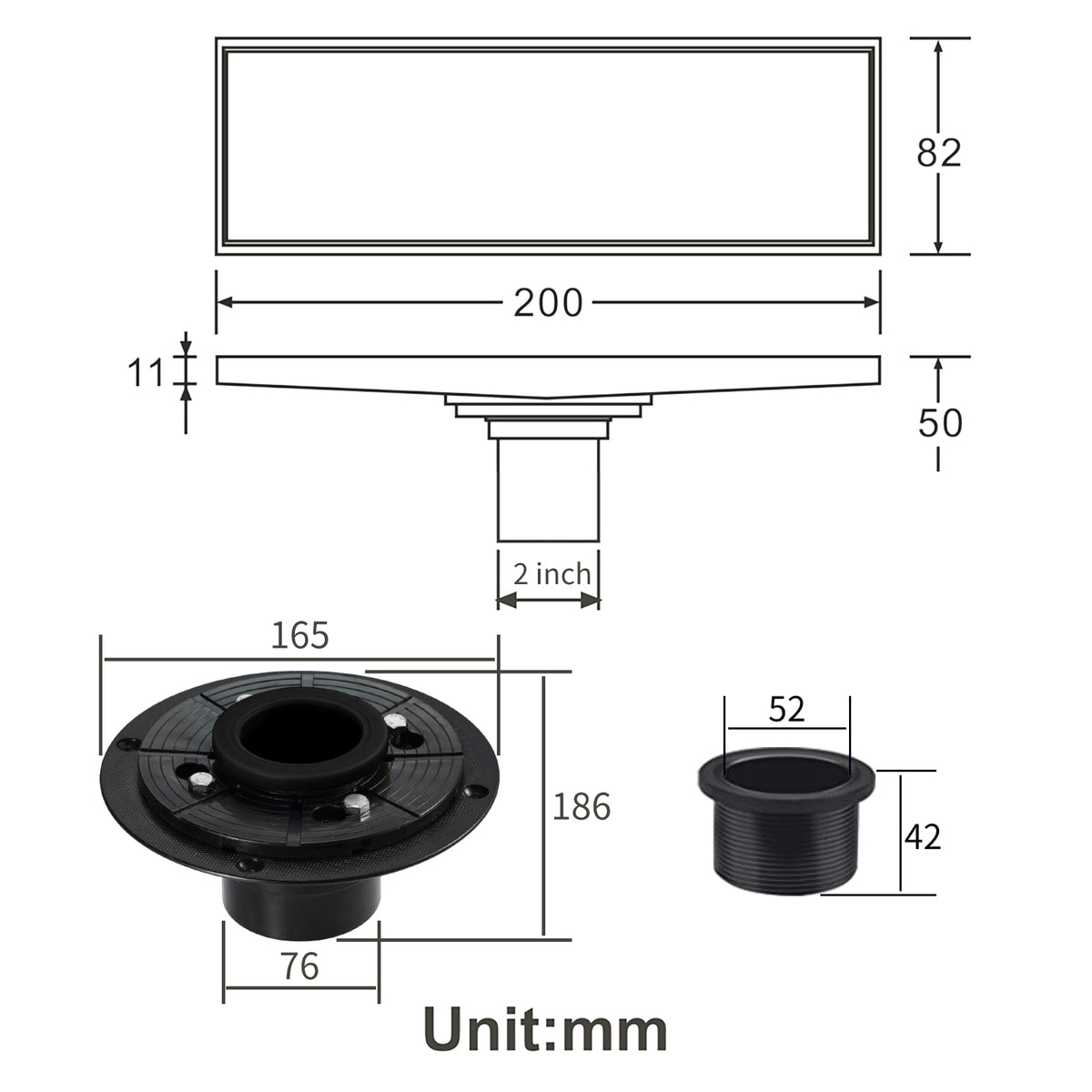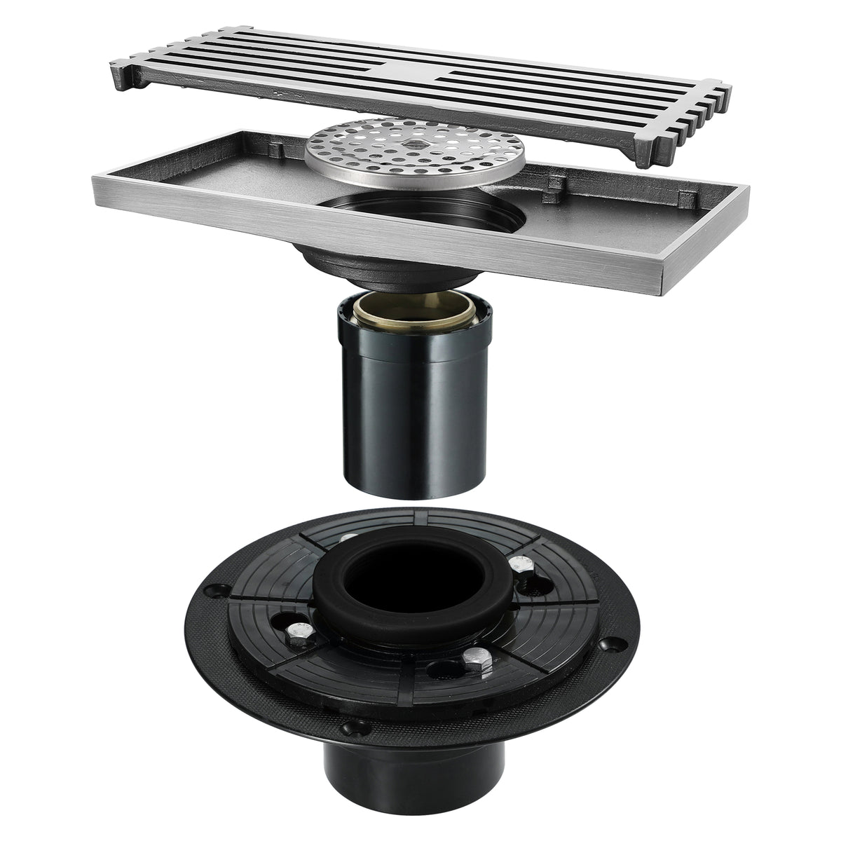 - 【Easy Adjustment & Installation】- The shower drain have two leveling feet, can adjust height as need. Fits US standard no hub drain base system, simply push the drain pipe down to the threaded adapter to install the drain, it comes with ABS base
