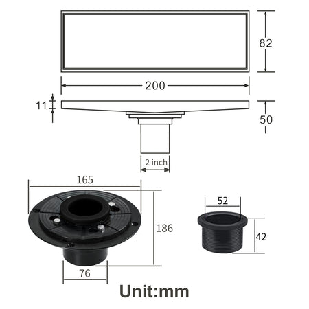 - 【Linear Shower Drain Size & Material】- 7.9" length, 3.2 " width, 2" central outlet. 36 L/min High Flow Capability. Base flange connects to drain pipe, fit standard U.S. plumbing connection. US ASTM standard Lead Free brass, Drain surface professional finished, protect against corrosion, scratches and rust for long-lasting durability
