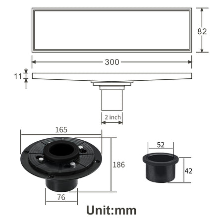 - 【Linear Shower Drain Size & Material】-11.8" length, 3.2 " width, 2" central outlet. 36 L/min High Flow Capability. Base flange connects to drain pipe, fit standard U.S. plumbing connection. US ASTM standard Lead Free brass, Drain surface professional finished, protect against corrosion, scratches and rust for long-lasting durability