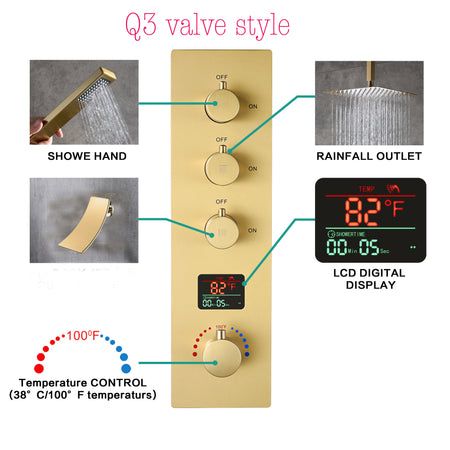 Ceiling mounted Brushed gold 3 way Thermostatic Shower valve system with waterfall tub spout that each function run all together and separately