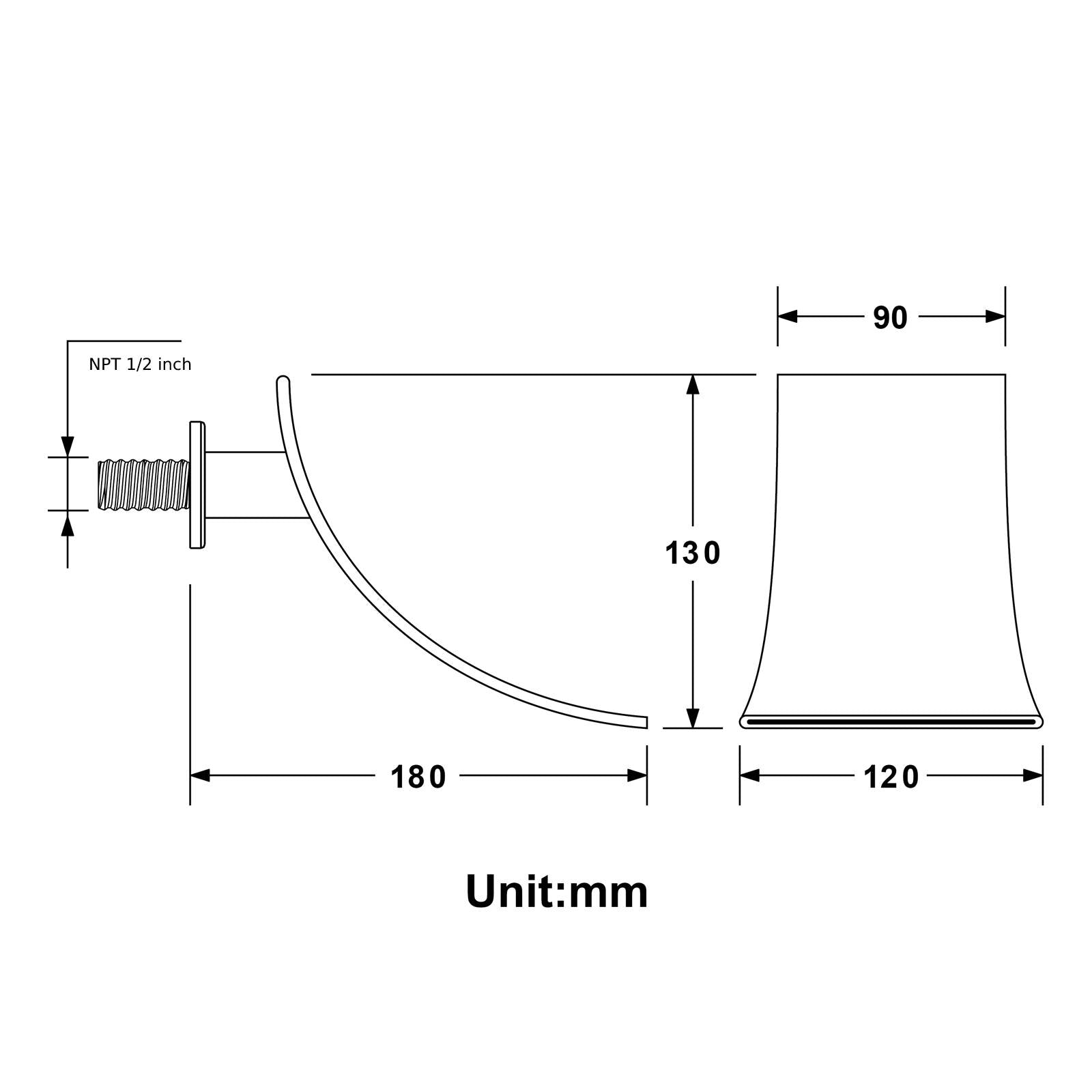 - wall shower arm: brass material, 16 inch length, with NPT ½ inch male thread and G ½ inch male thread and flange