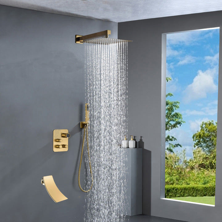 wall mounted Brushed gold 3 way Thermostatic Shower valve system with waterfall tub spout that each function run all together and separately