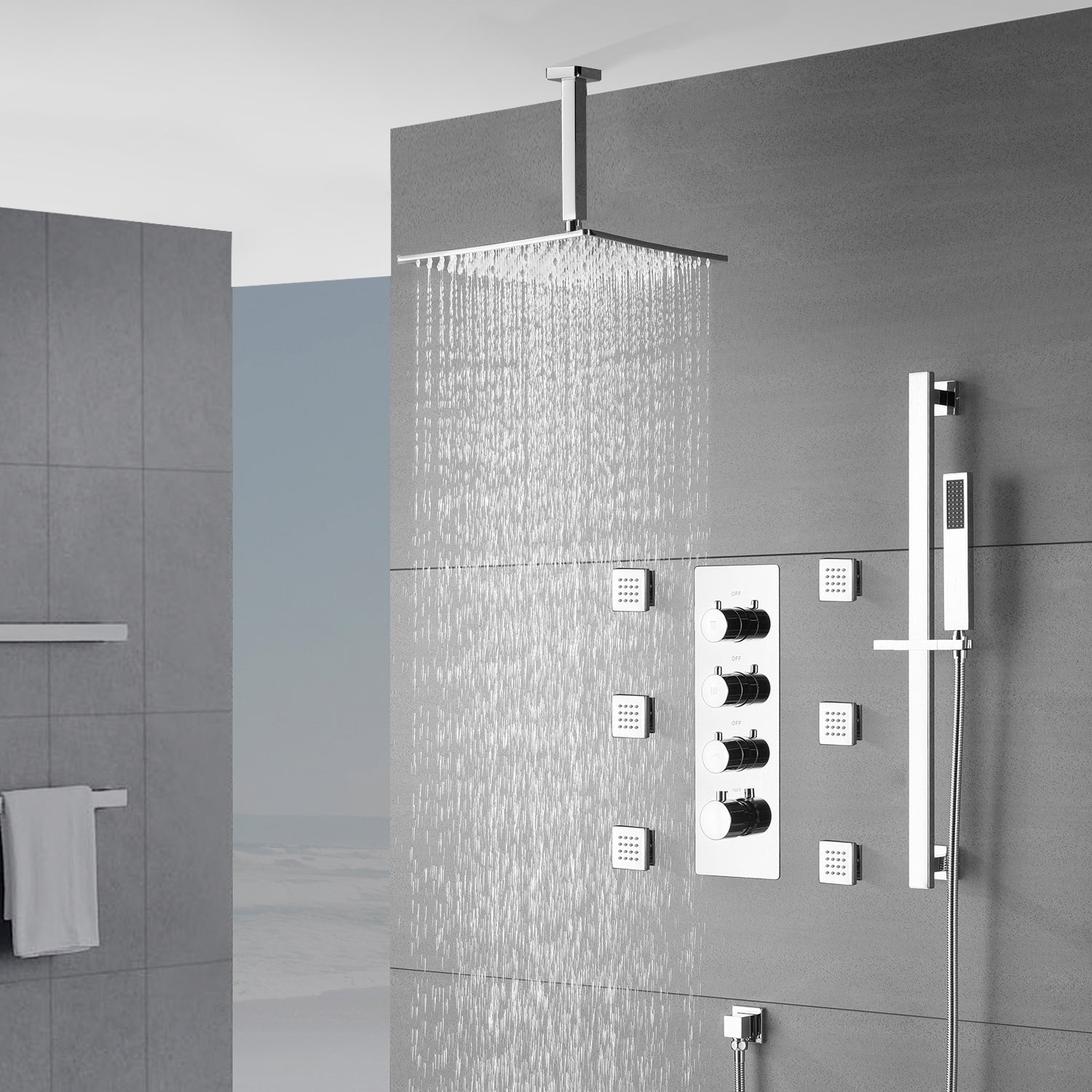 Chrome 12 inch or 16 inch ceiling mount 3 way thermostatic shower faucet with 6 body jets and sliding bar