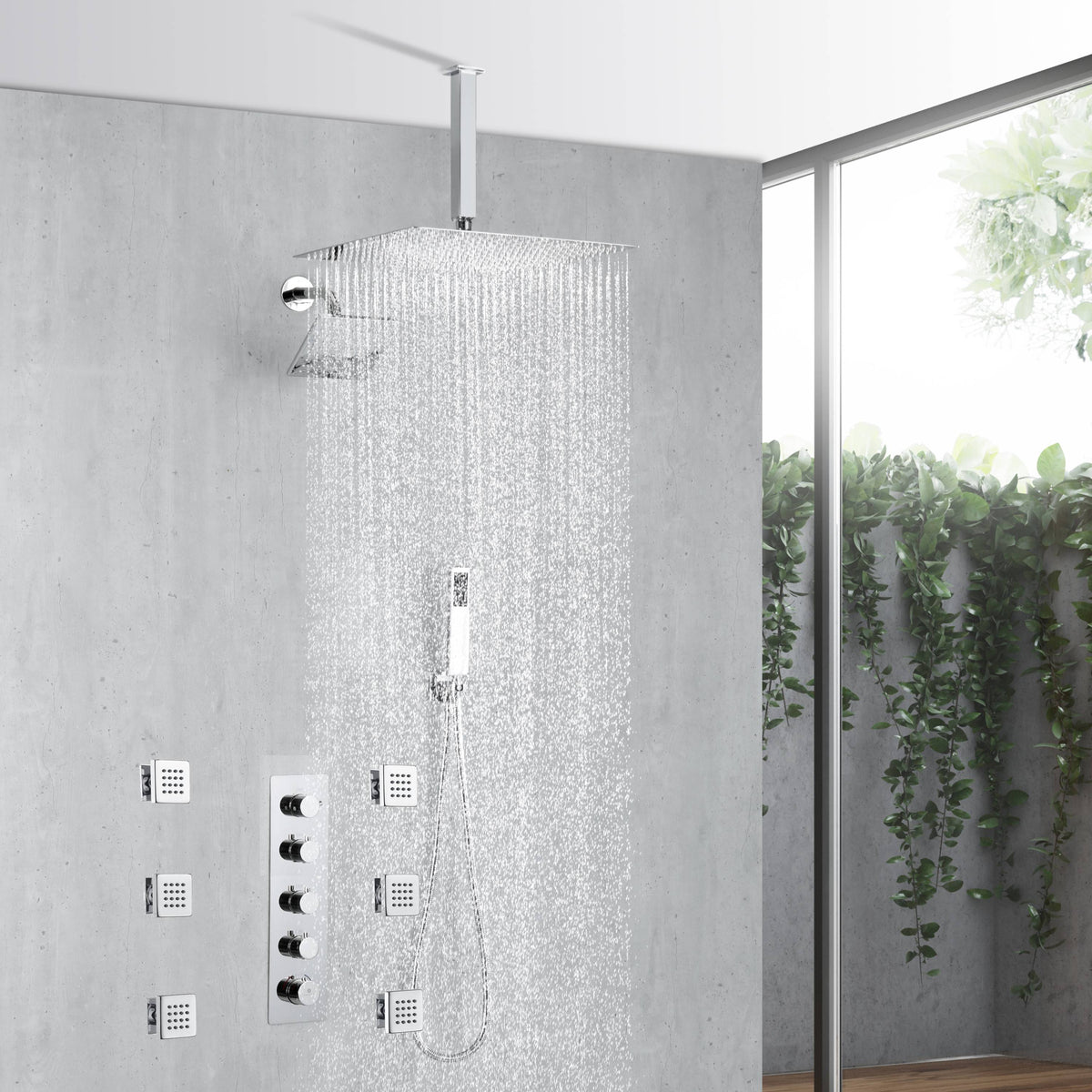 Chrome Ceiling 12 Inch or 16 inch Rainfall Shower Head Wall Mount 6 Inch Regular High Water Pressure Shower Head 4 Way Thermostatic Shower Faucet Each Function Work All Together And Separately