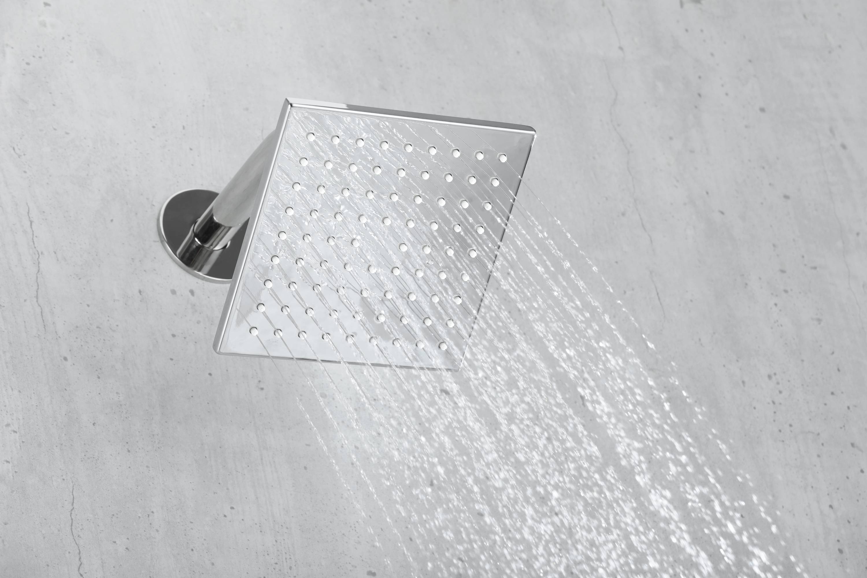 - This Ceiling mount shower head fits large bathroom. Rainshower Arm is 9" with flange straight. 8" handheld shower with 5' hose. 20" or 24'' square rainfall shower head with swivel 15 degree angle adjustablility. NPT 1/2" male mounting threads and covers are included for easy installation.
