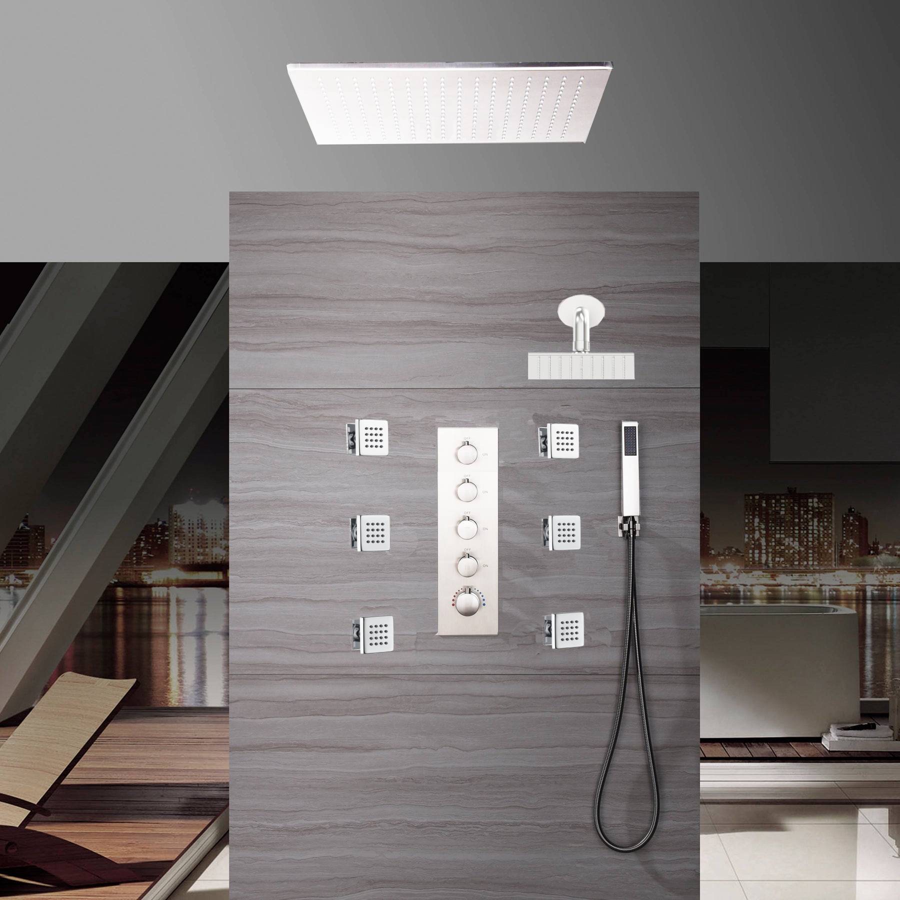 - The system includes 20" or 24'' rain shower head, a high pressure 6" shower head, a brass handheld sprayer, 9” shower arm, 59” shower hose, 4 Way thermostatic valve mixer,6 X 2 inch body sprayers. Reliable craftsmanship and material - each piece of this product was made with solid materials, including brass and high grade stainless steel.