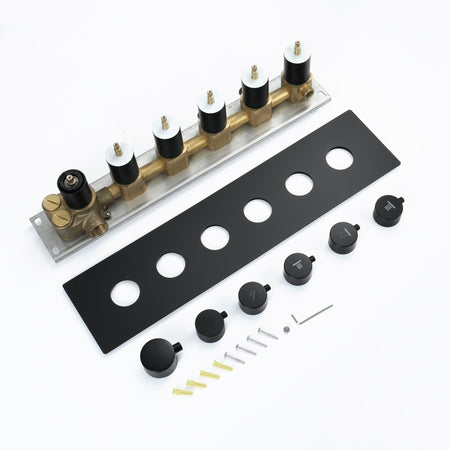 5 way thermostatic high water flow rough in valve with trim, each function's water pressure and water flow can be adjusted by knobs, it requires 3/4 inch hot and cold water pipes lines. Each function runs all together, combo or separately by the faucet.