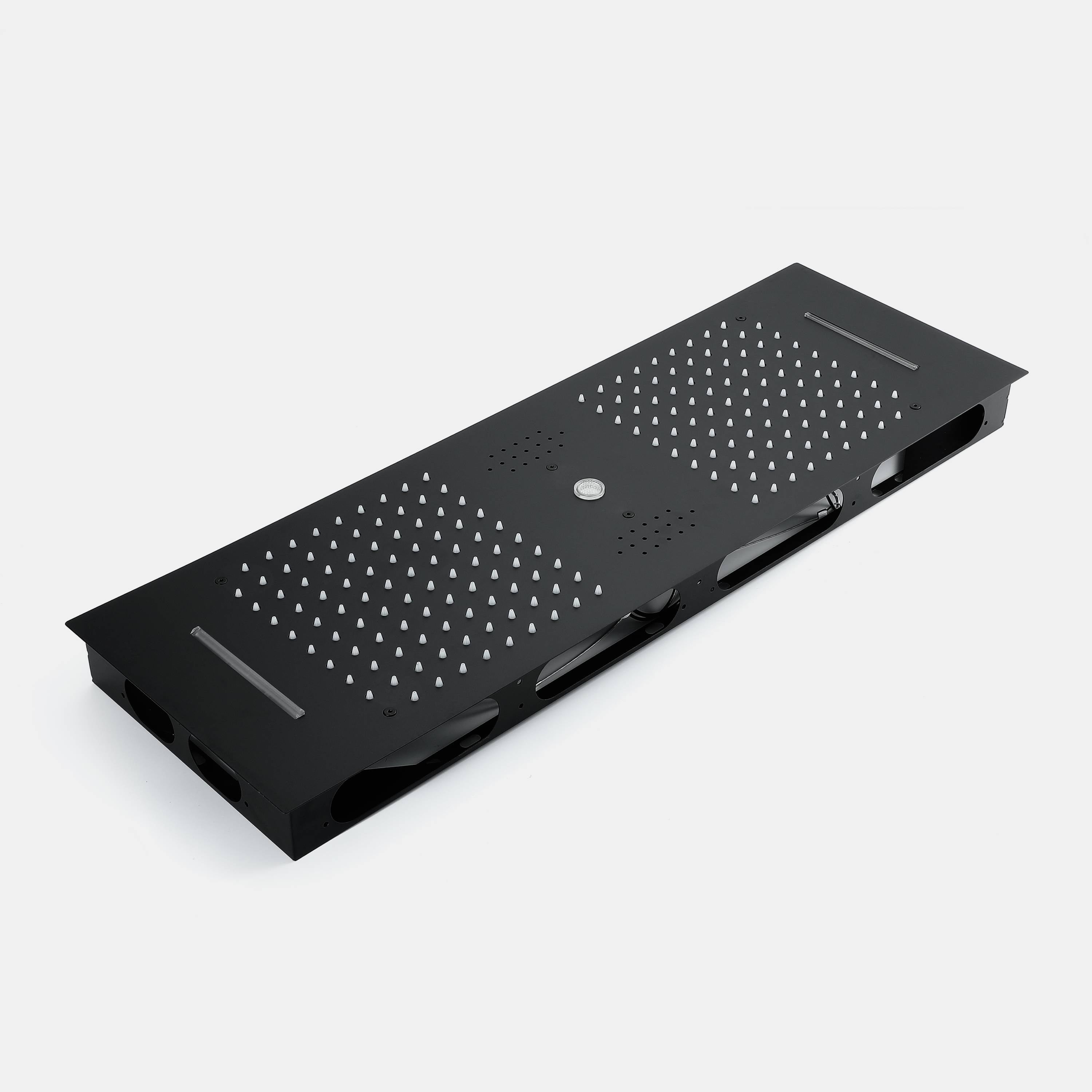 Matte Black 36 Inch Flushed Ceiling Mount Rainfall Waterfall Water Column 64 LED Light Bluetooth Music Shower Head 5 Way Thermostatic Shower Faucet Set with Body Jets and Regular heads
