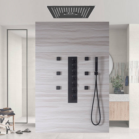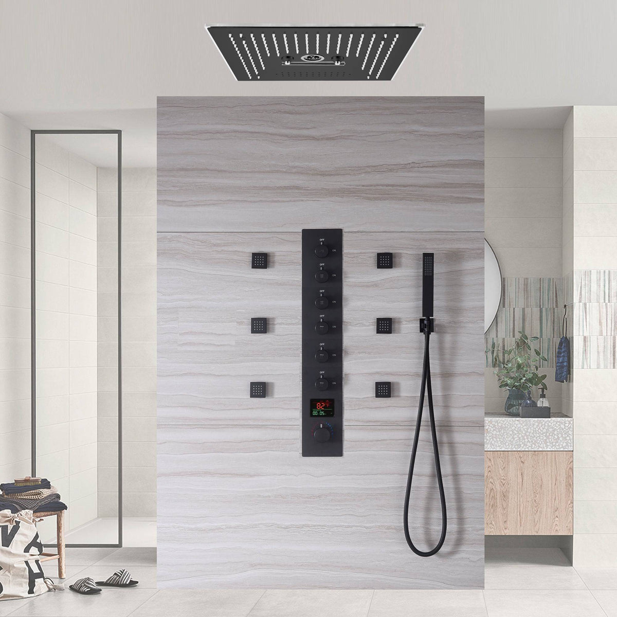 Matte black flushed on 16 inch rainfall waterfall mist hydro-water massage 64 LED light Bluetooth Music shower head 6 way digital display shower faucet with body jets