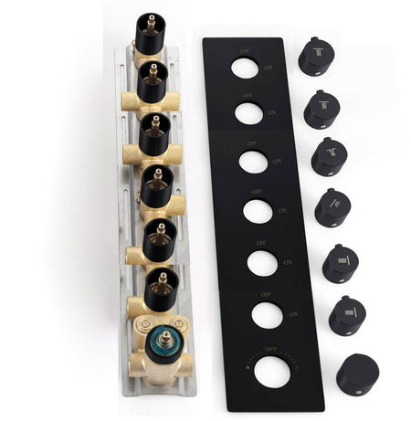 This system features a 6-way thermostatic high water flow rough-in valve with trim, allowing for adjustment of water pressure and flow for each function via knobs. It requires 3/4 inch hot and cold water pipe lines. All functions can run together, in combination, or separately using the faucet.