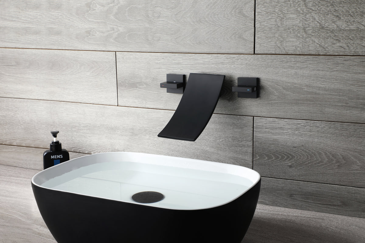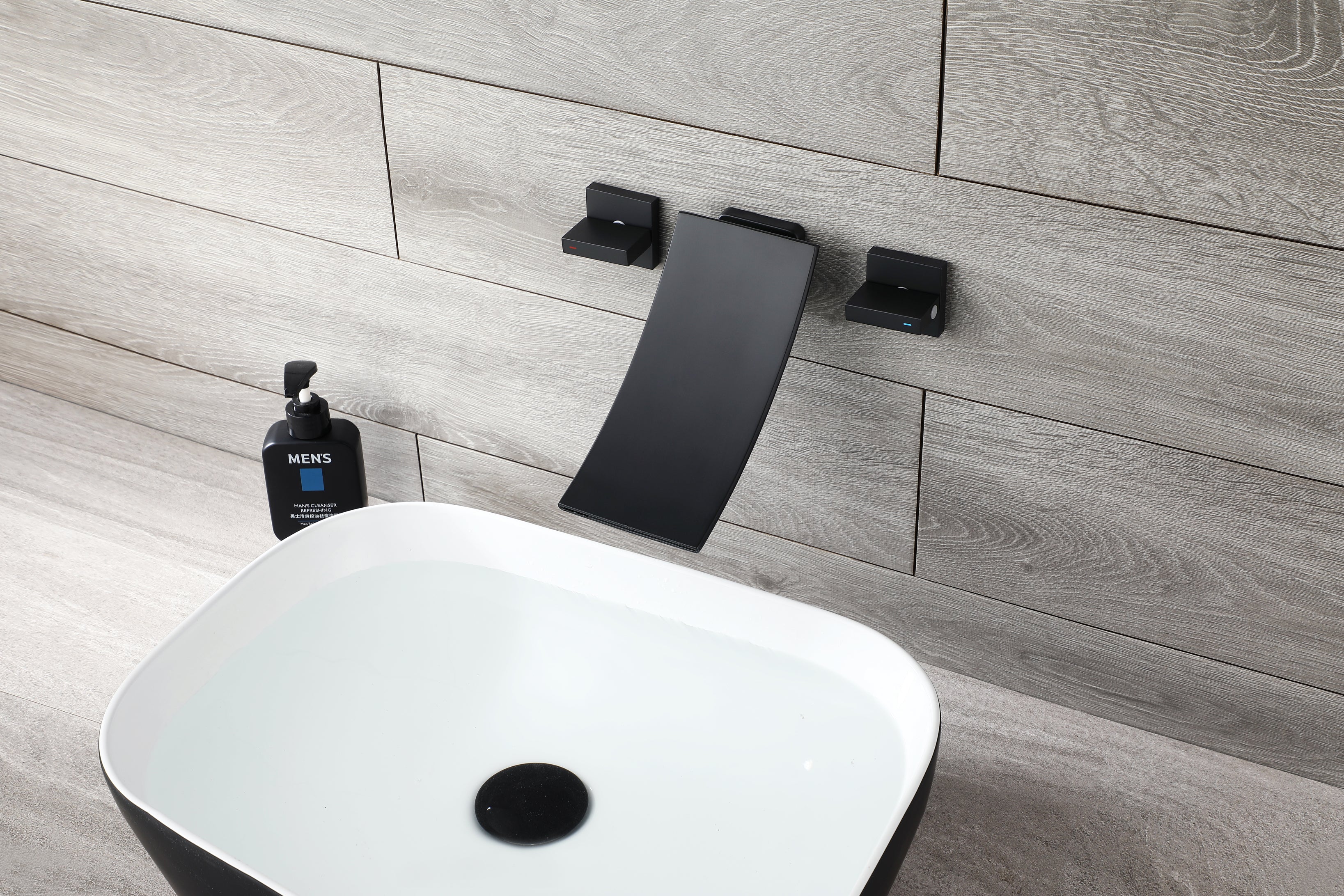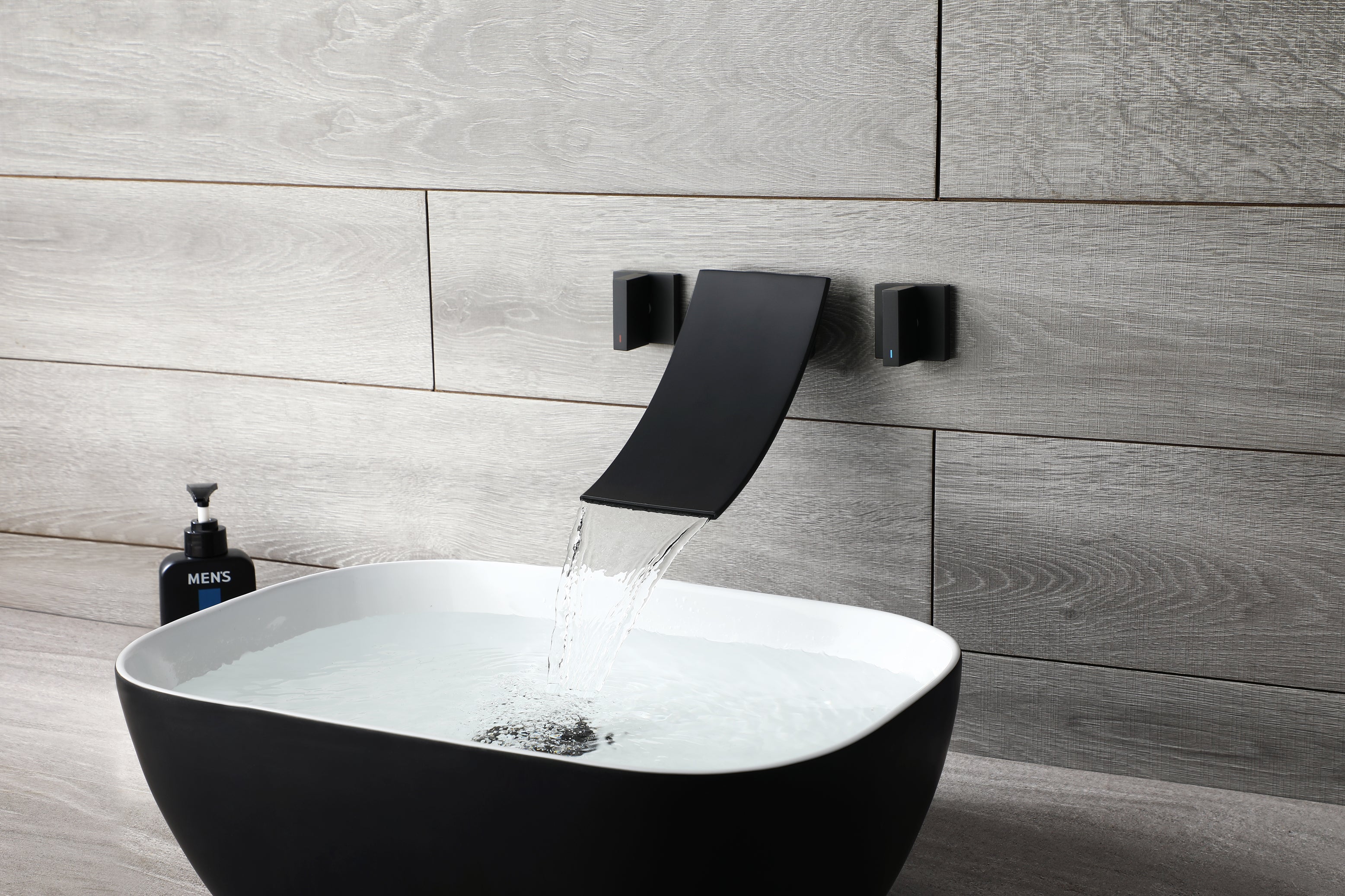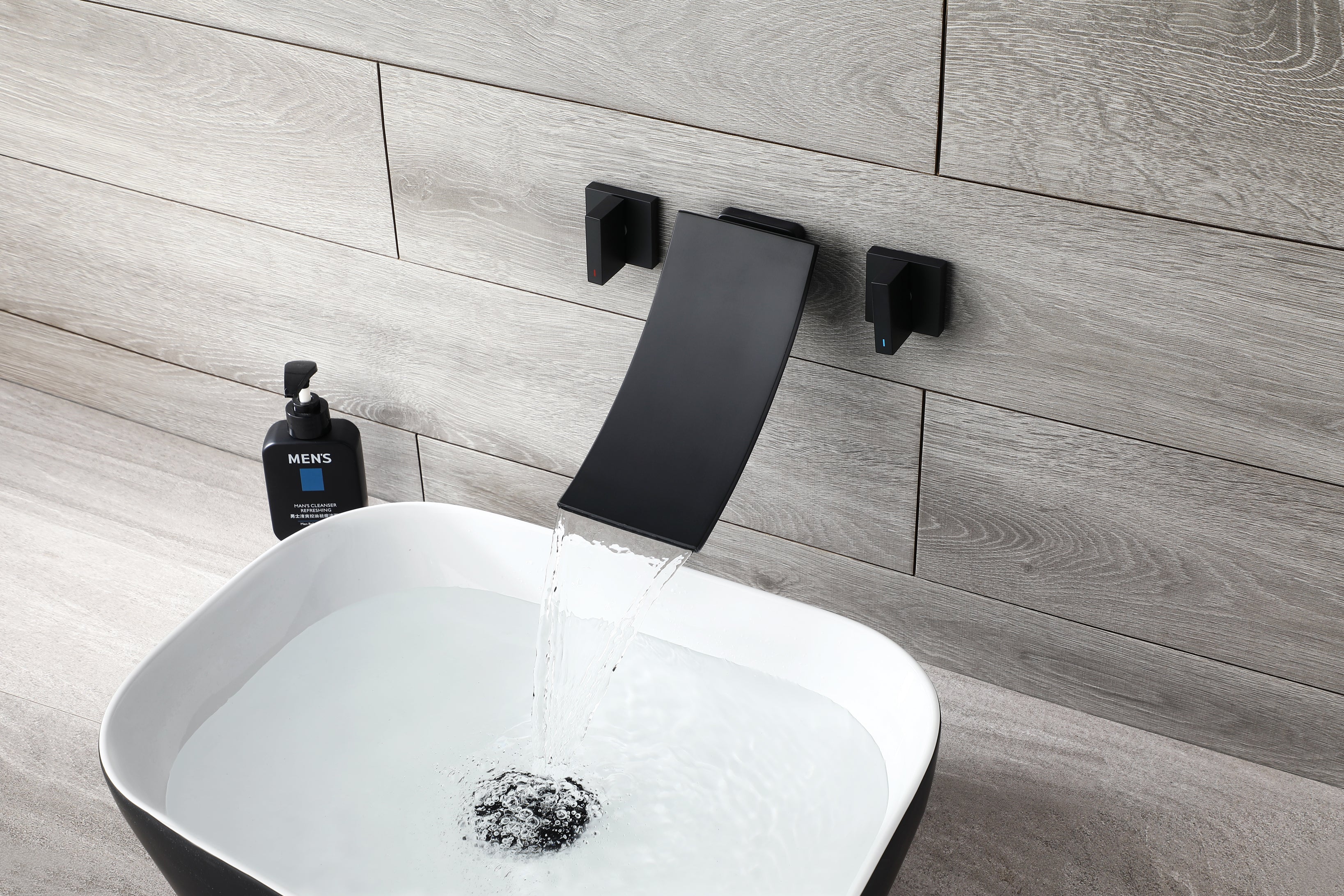 matte black waterfall wall mount bathroom sink faucet with overflow brass pop up drain