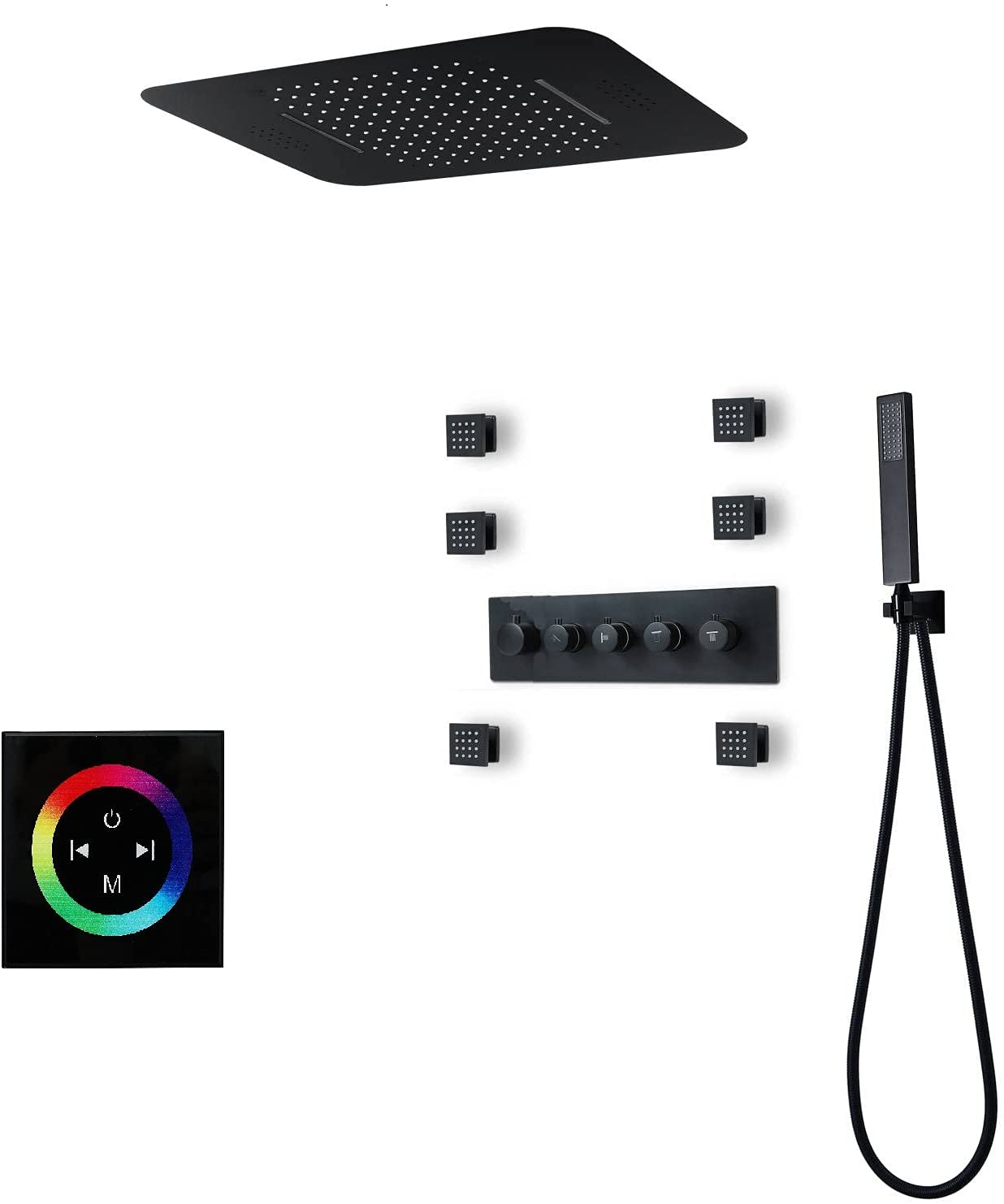 Matte Black 64-Color LED Lights Bluetooth Music Rainfall Waterfall 23 Inch Shower Head 4 Way Thermostatic Shower System with Body Jets
