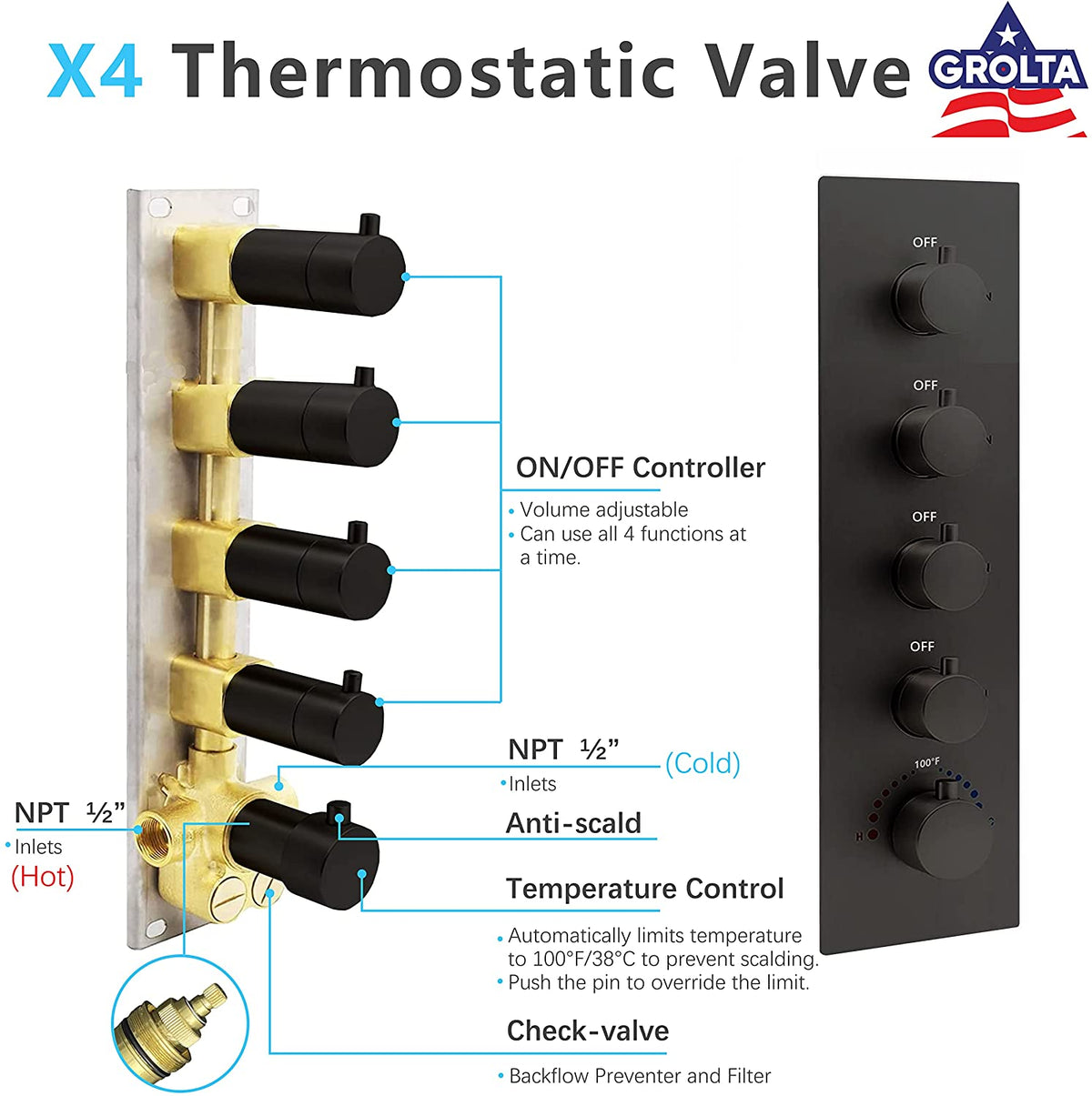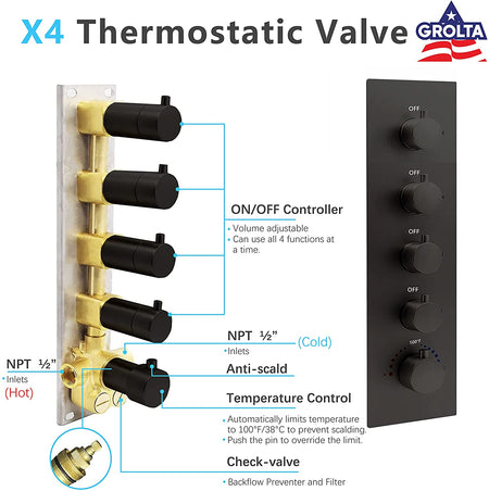 - 4 way thermostatic rough in valve with trim, we can control water pressure,water temperature and water flow by knobs, it requires 1/2 inch hot and cold water pipes lines