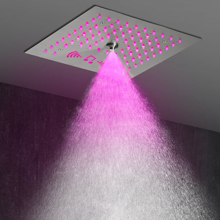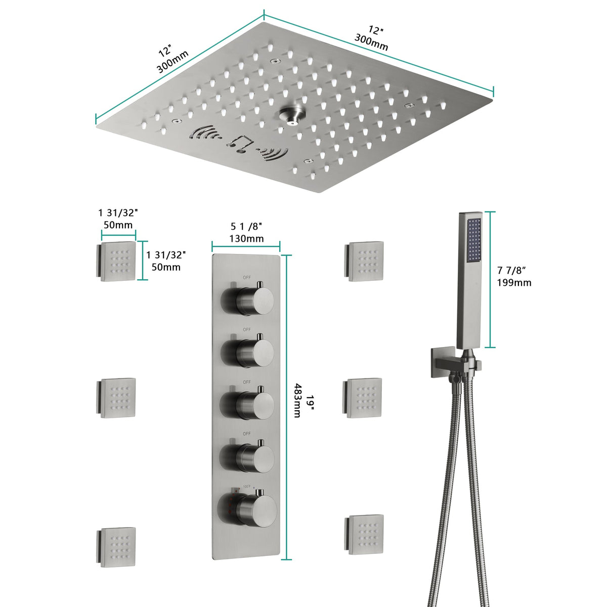 Flushed mount 12 inch 64 LED colors light Brushed nickel Bluetooth Music 4 Way Thermostatic Shower Faucet with body sprayers