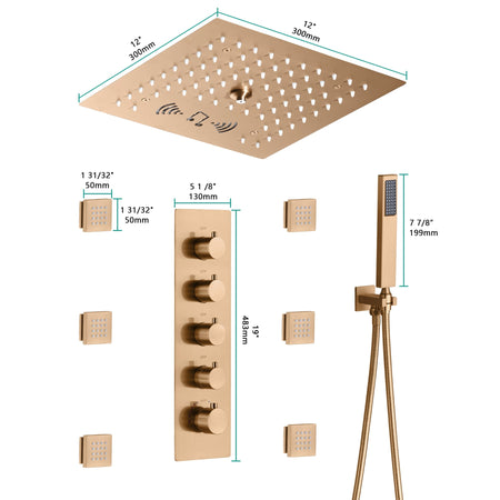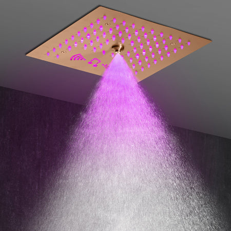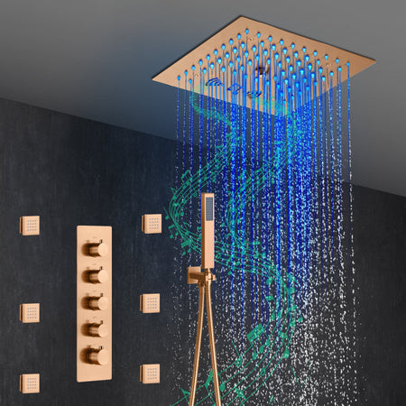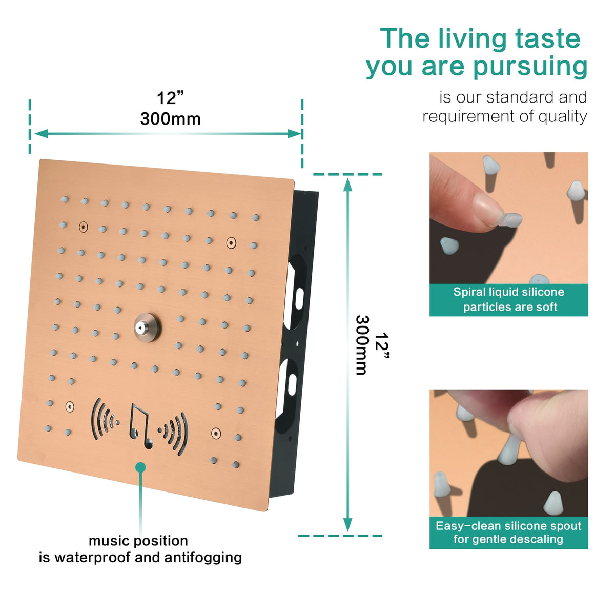 Flushed mount 12 inch 64 LED colors light Rose Gold Bluetooth Music 4 Way Thermostatic Shower Faucet with body sprayers