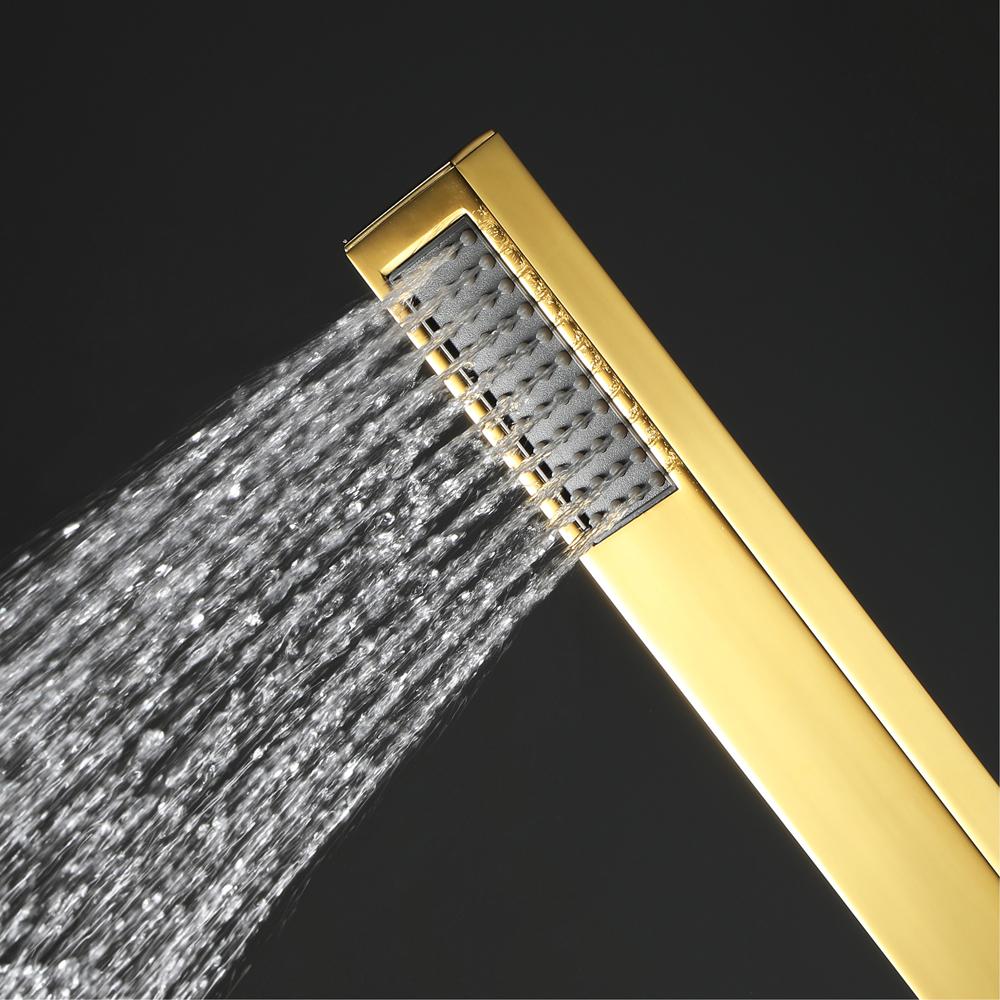 Brass handheld shower, 59inch shower hose,4 function brass thermostatic valve that each functions work at the same time and separately. 6pcs 2X2INCH brass body jets.