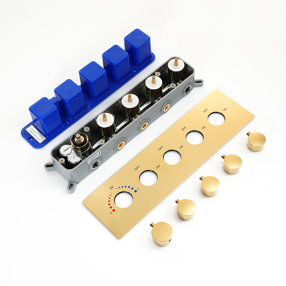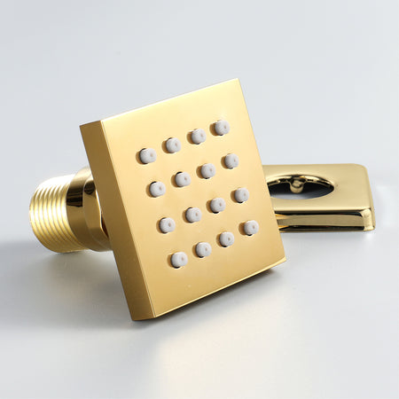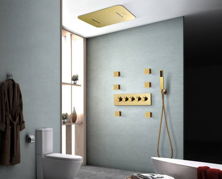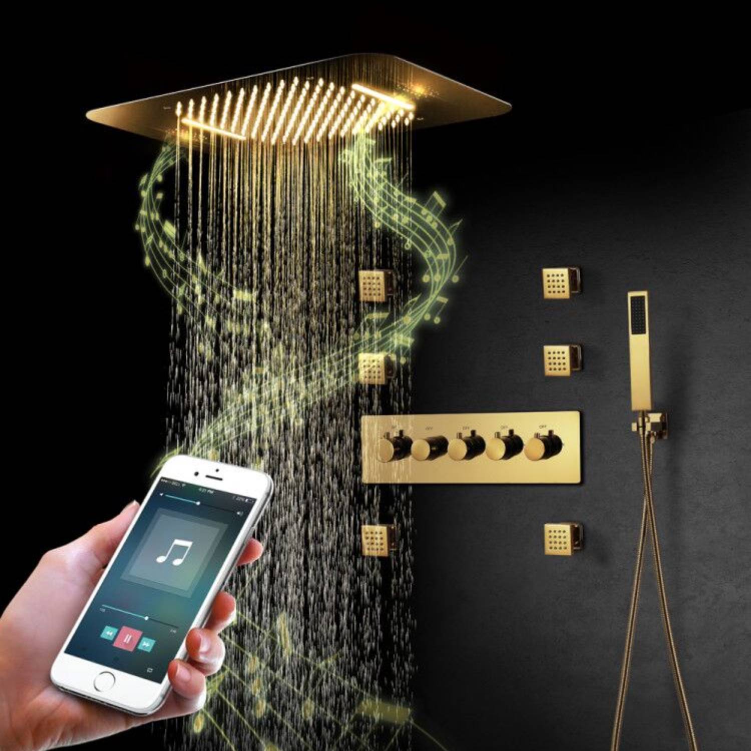 Gold Music LED Flushed in 23X 15inch shower head 4 way thermostatic valve that each function run at the same time and seperately