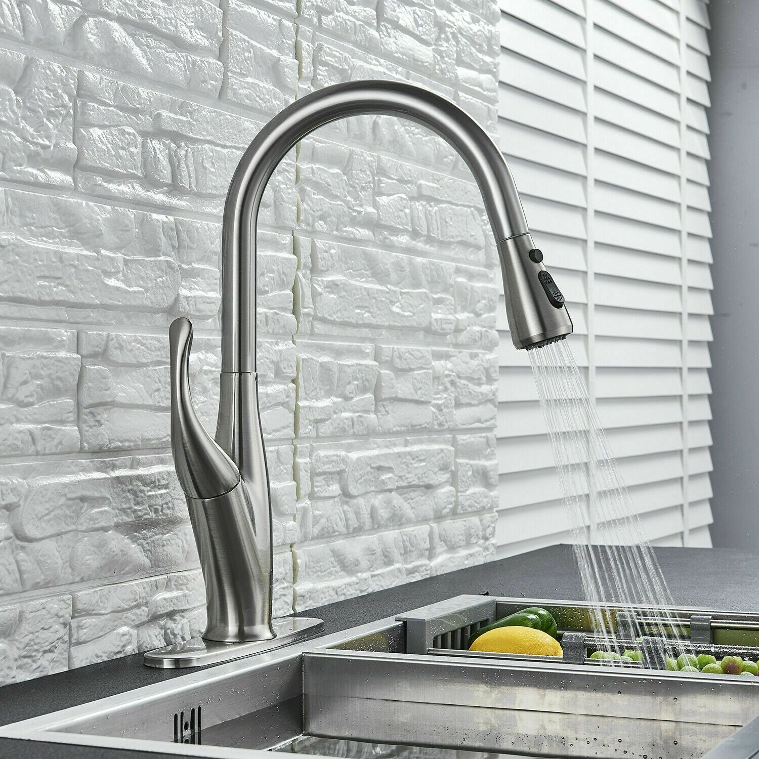 Kitchen Sink Faucet Pull Out Sprayer Brushed Nickel Mixer Tap With Deck Plate