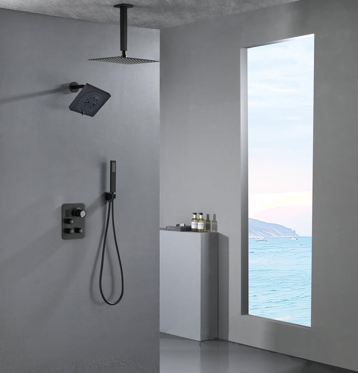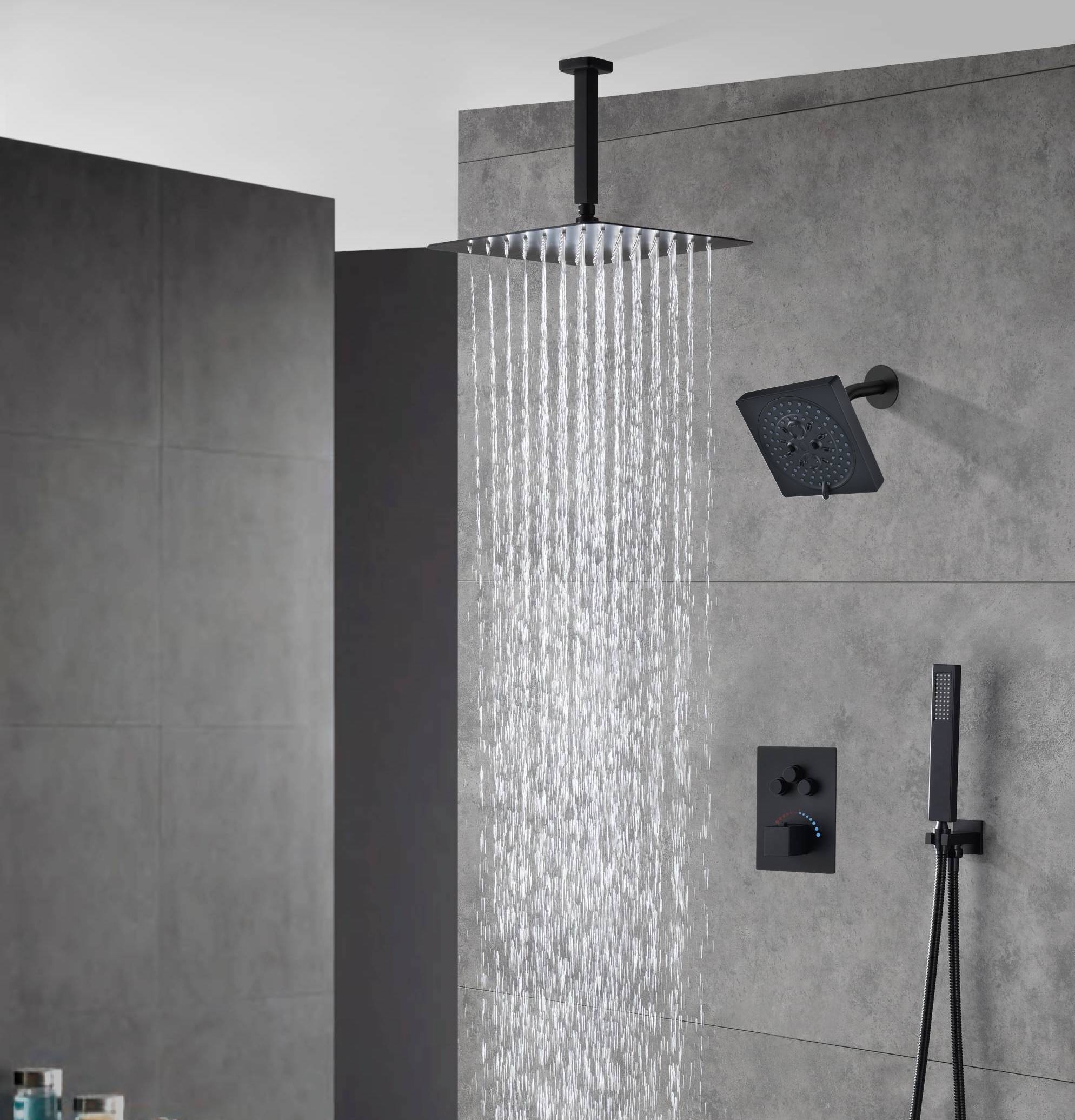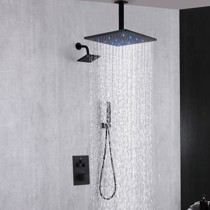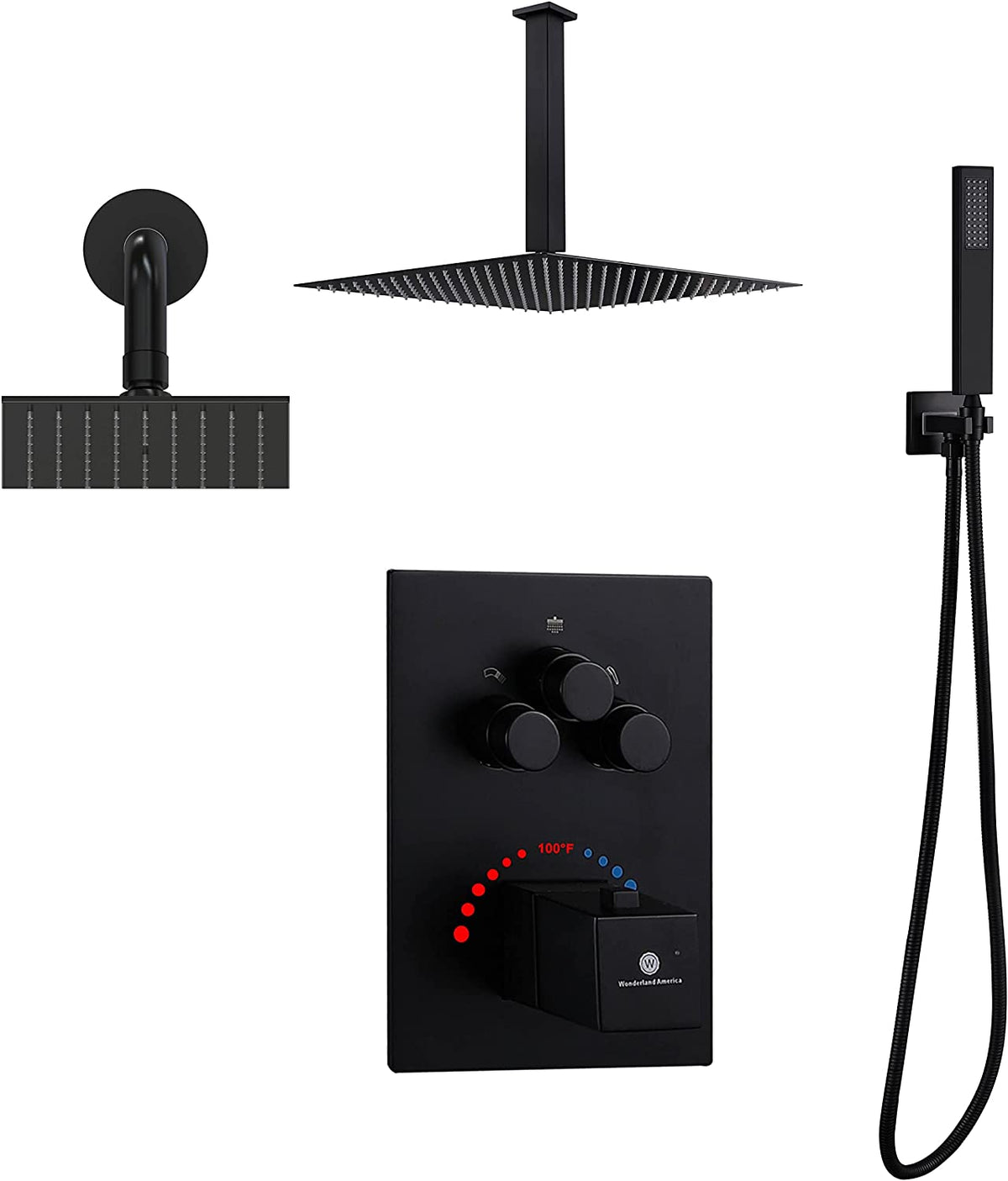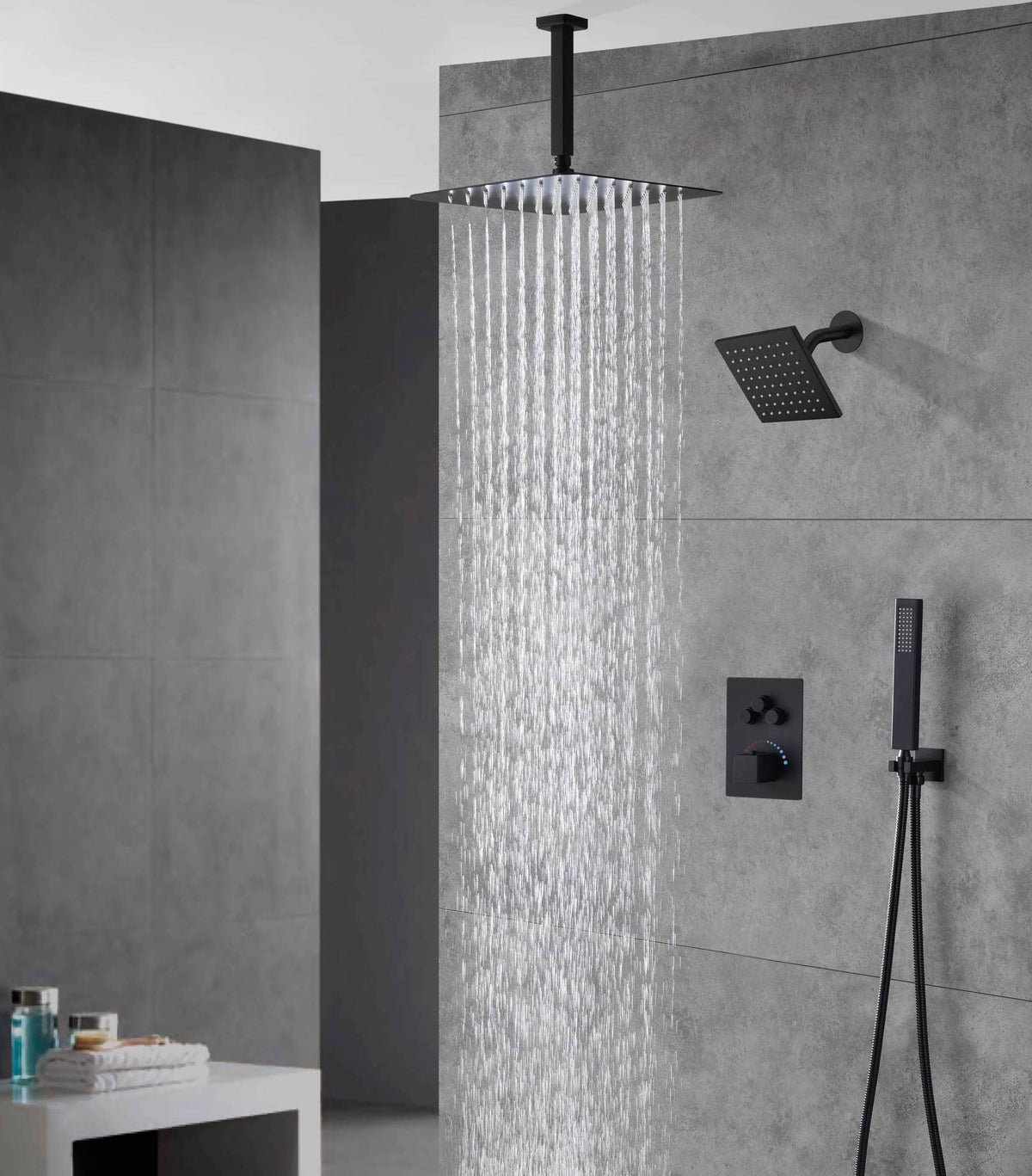 Matte Black Ceiling Mount 12 Inch or 16 inch Rainfall Shower Head Wall Mount 6 Inch Regular High Water Pressure Shower Head 3 Way Thermostatic Shower Faucet Each Function Work All Together And Separately