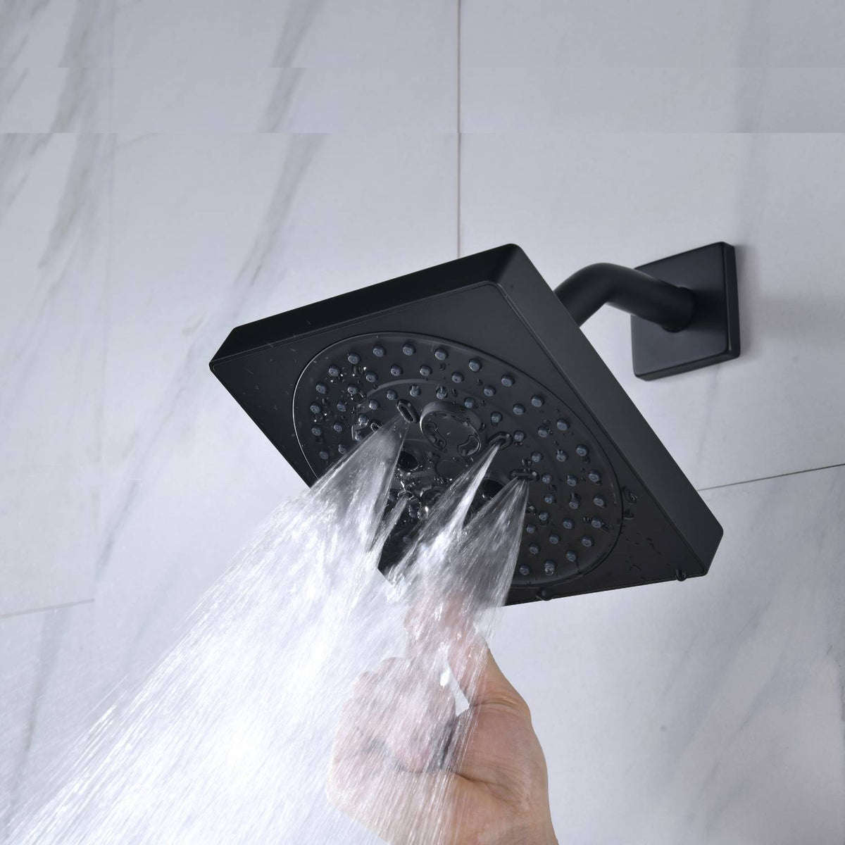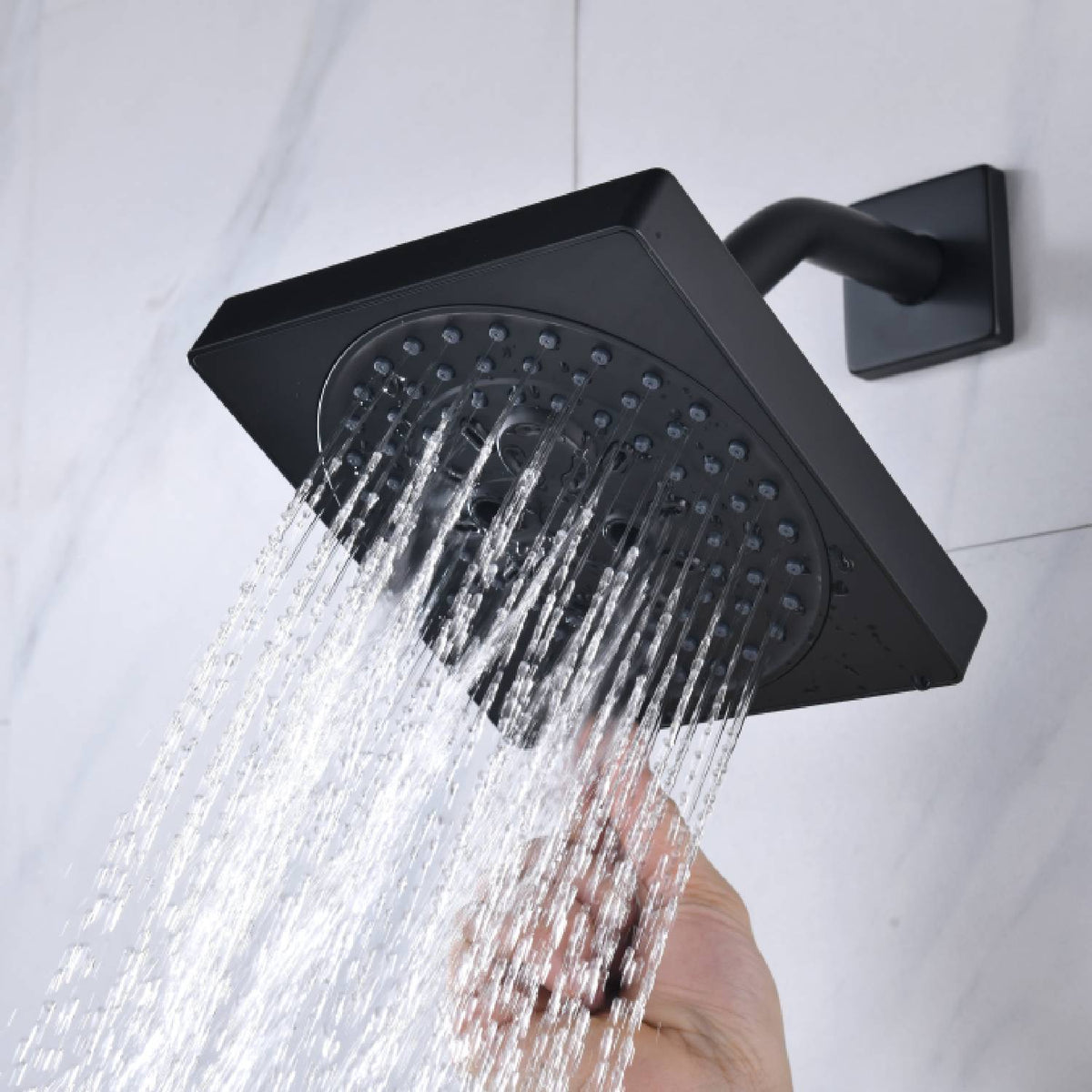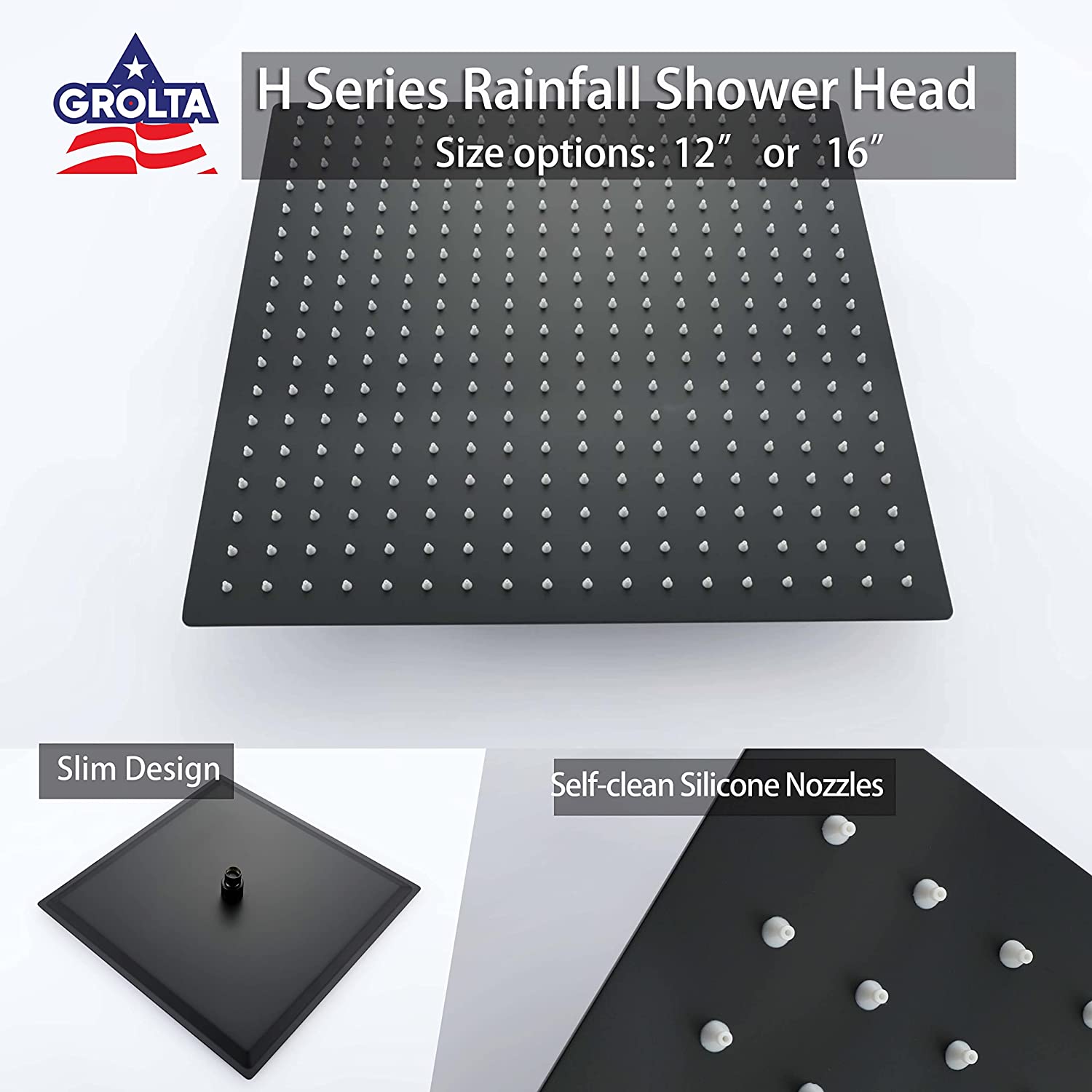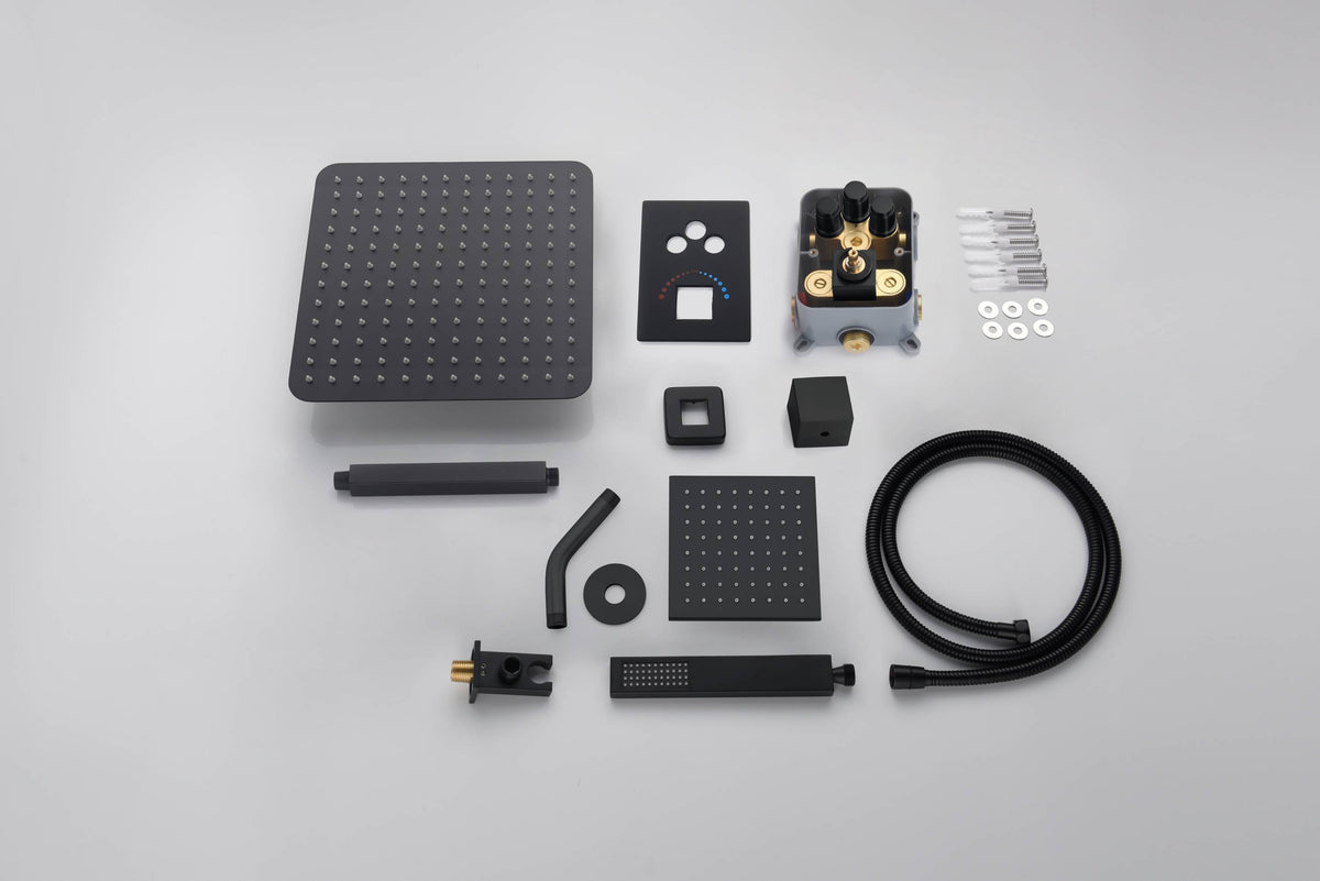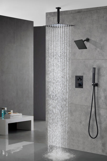 Matte Black Ceiling Mount 12 Inch or 16 inch Rainfall Shower Head Wall Mount 6 Inch Regular High Water Pressure Shower Head 3 Way Thermostatic Shower Faucet Each Function Work All Together And Separately