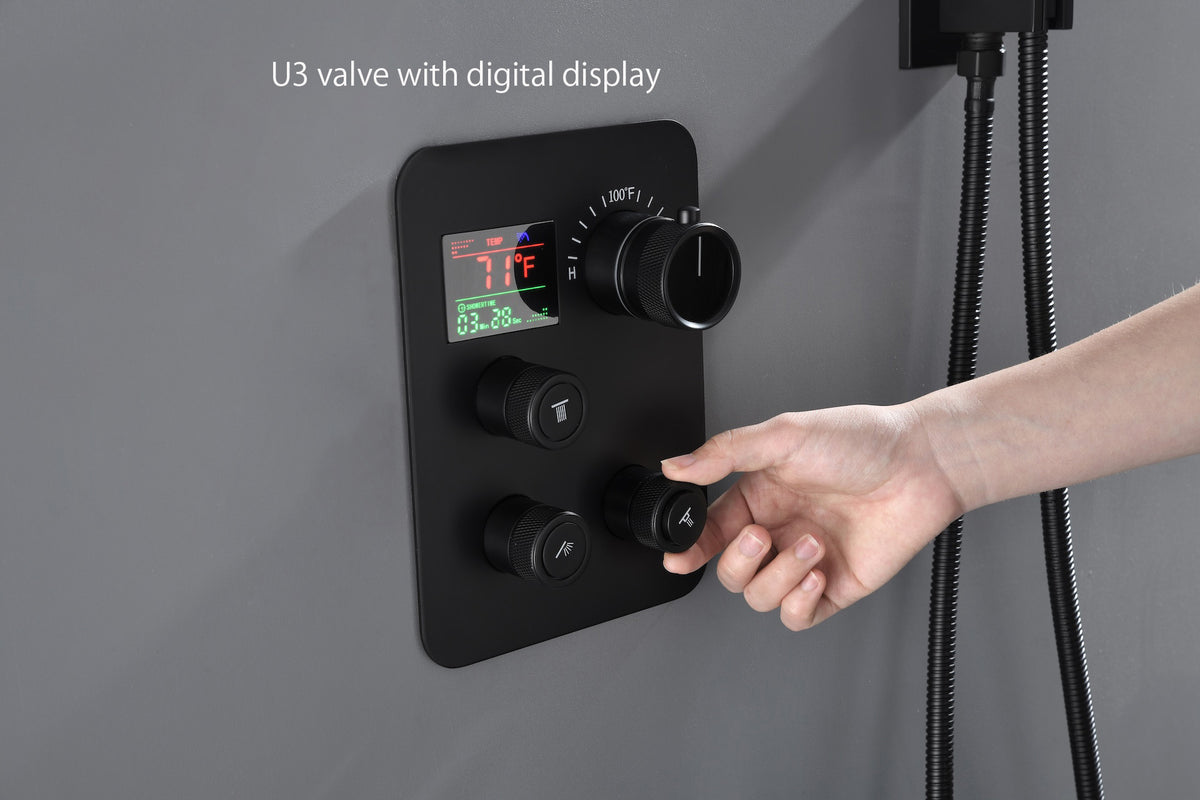 (1) U3 valve style: with digital display, the push buttoms can adjust the water flow and water pressure, it requires 1/2 inch or 3/4 inch hot and cold water pipelines, water flow 2.5~7.8GPM ( high water flow);