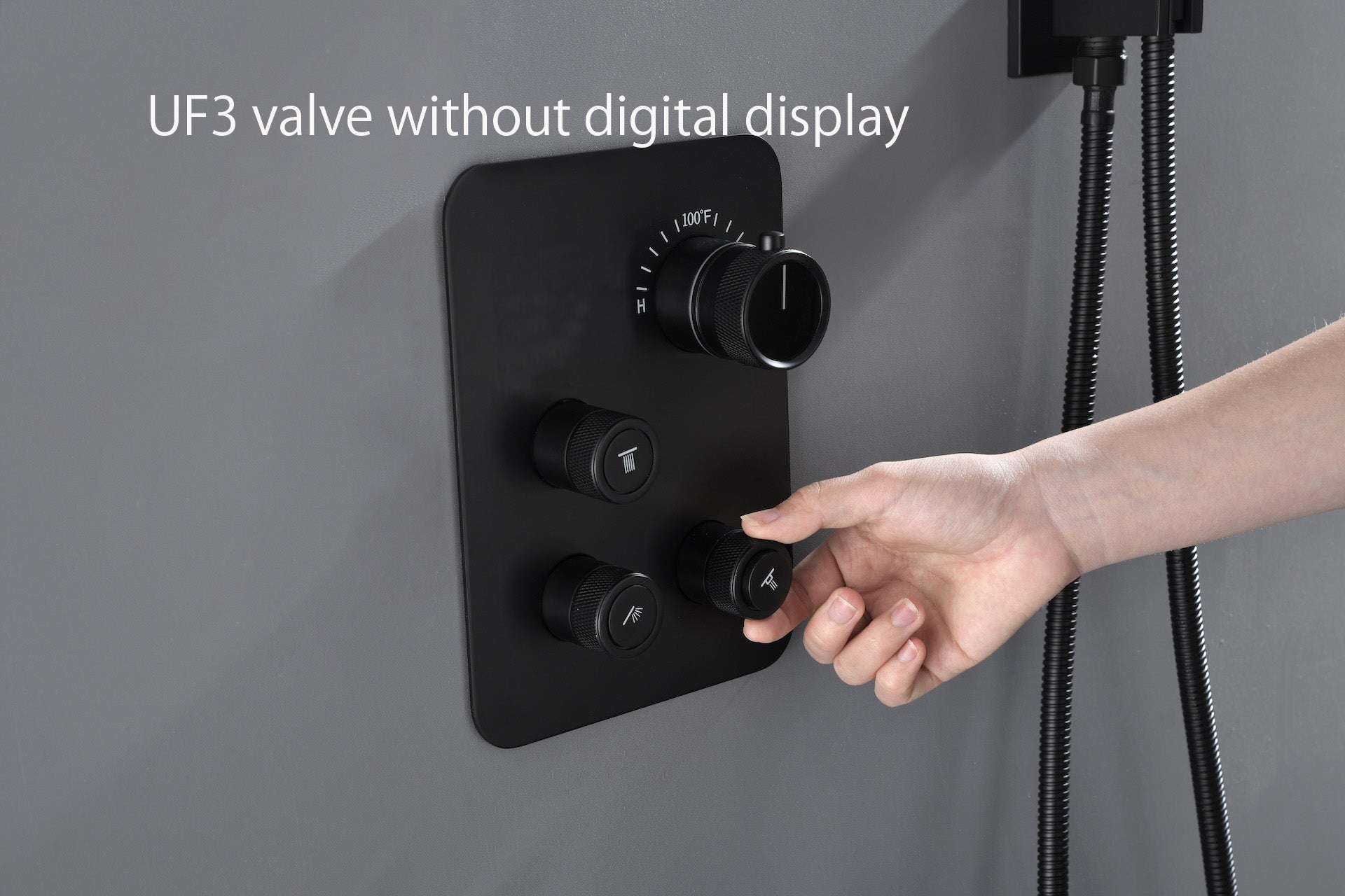 (2) UF3 valve style: without digital display, the push buttoms can adjust the water flow and water pressure, it requires 1/2 inch or 3/4 inch hot and cold water pipelines, water flow 2.5~7.8GPM ( high water flow)