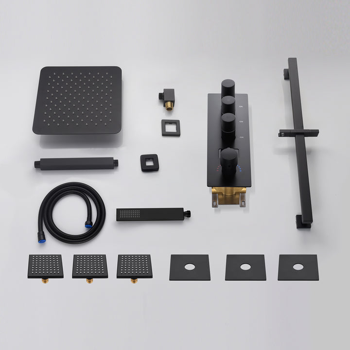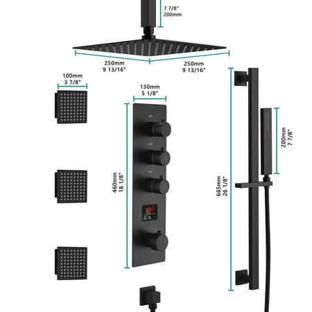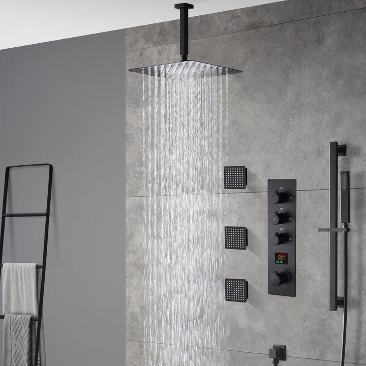matte black ceiling mount 12 inch or 16 inch rain head 3 way digital display thermostatic shower faucet with large body sprayers