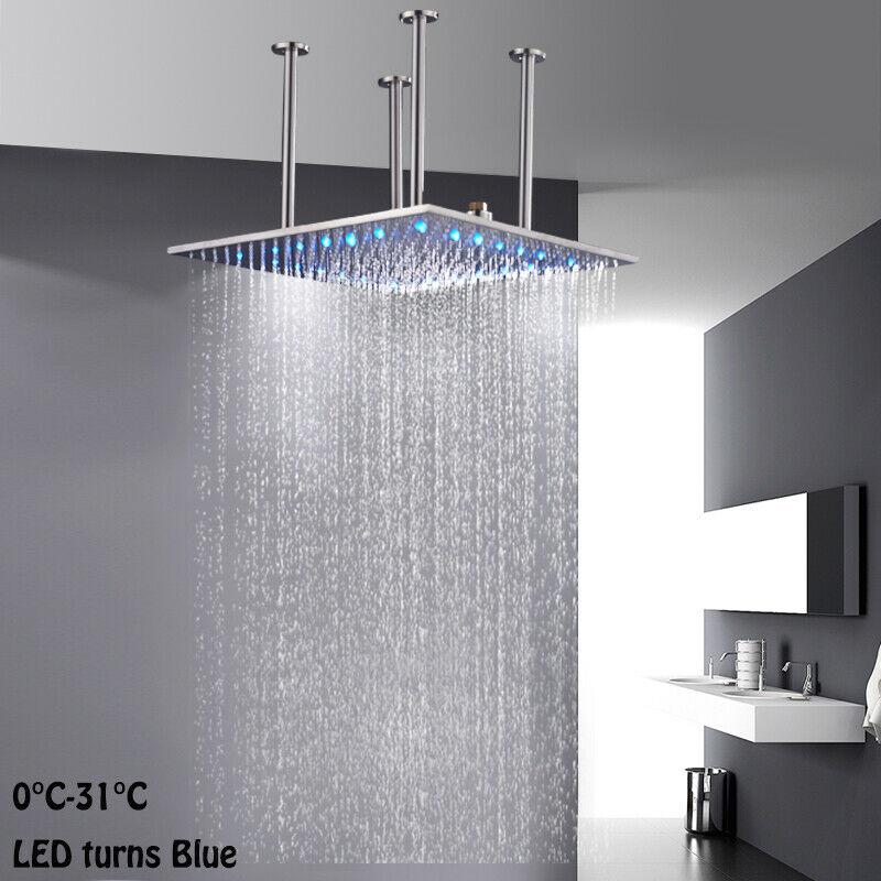 - Heavy-Duty LED Rain Shower with Blue, Green or Red LED.Water Pressure Power Supply. It Changes the Color by Detecting the Water Temperature. The Rain Shower Head is Oversized, 20 x 20 or 24 x 24 Inches, and Completely Covers 2 or 3 peaple Even More.