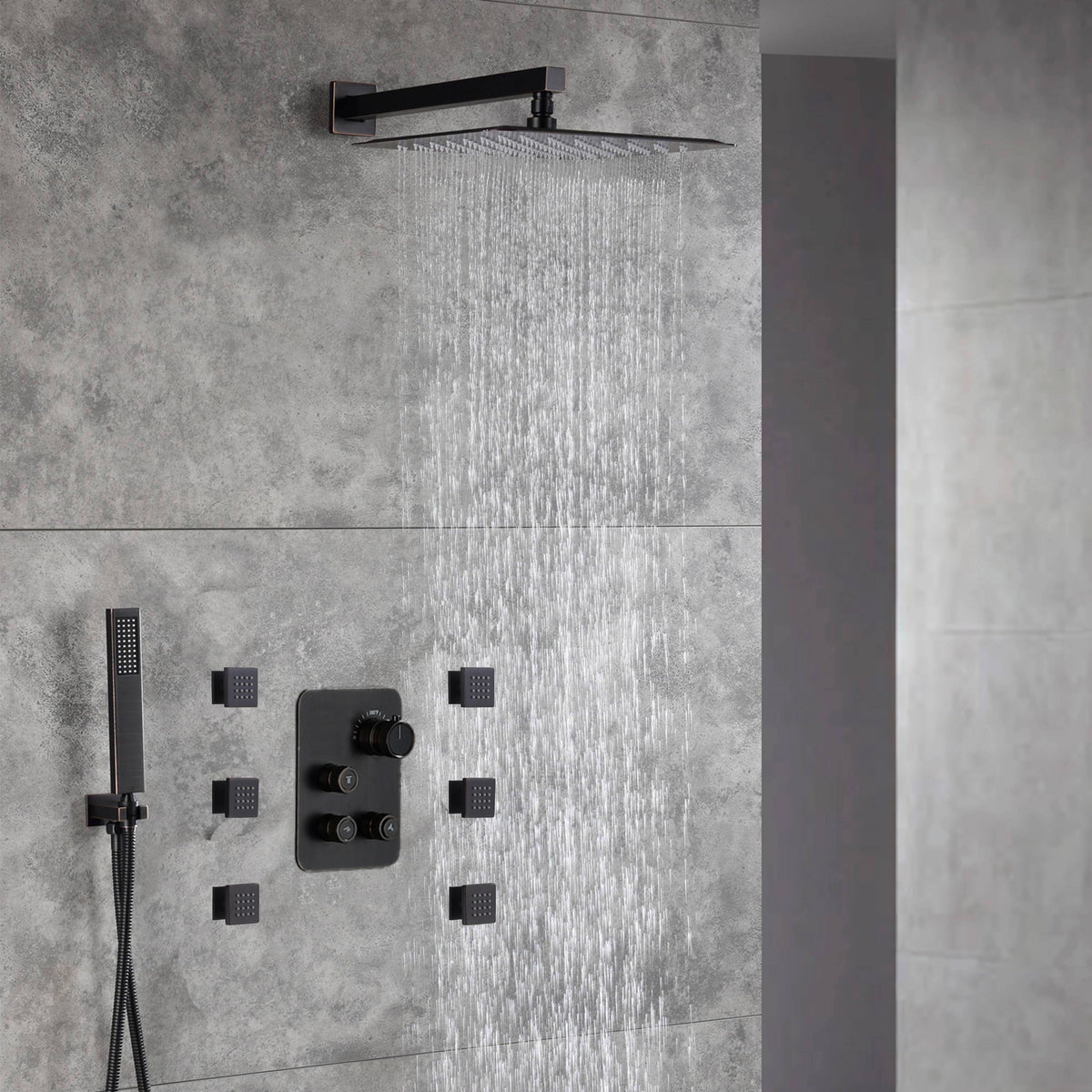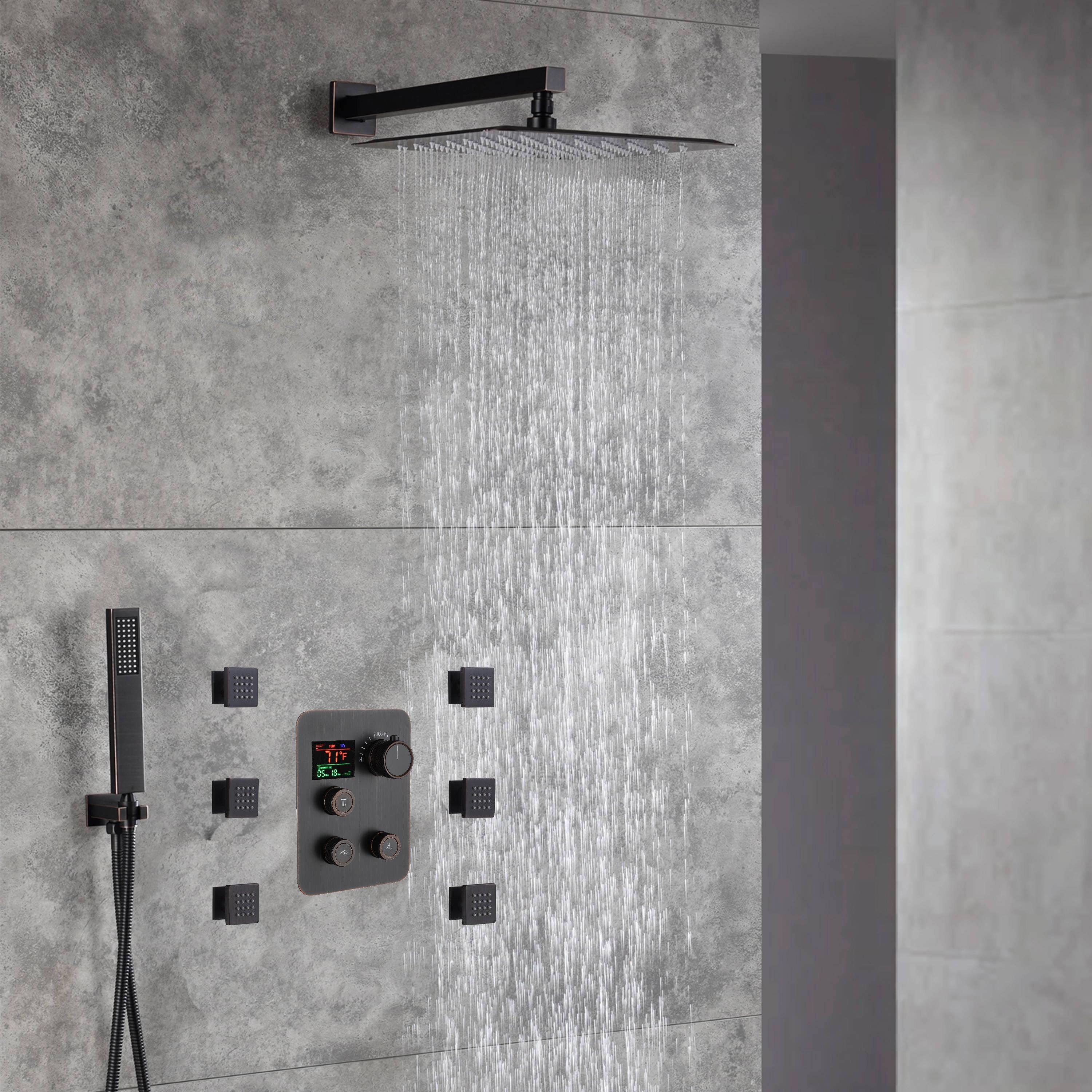 Oil Rubbed Bronze 3 way thermostatic Shower Faucet System with 6 body jets each function work at the same time and separately