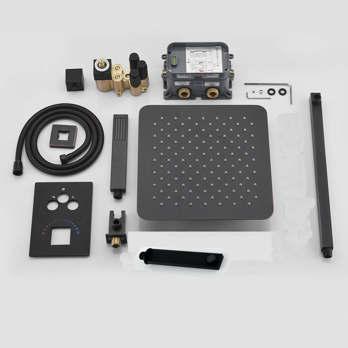 - 1x stainless 12inch shower head, 1x brass wall shower arm with plate, 1x 3 way brass thermostatic rough in valve with trim (including diverter valve), 1 x brass tub spout with cover, 1x brass handle sprayer,1x stainless shower hose 59inch,1x brass shower holder, 1x instruction