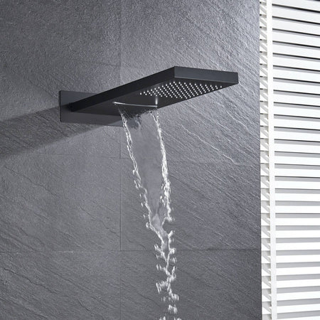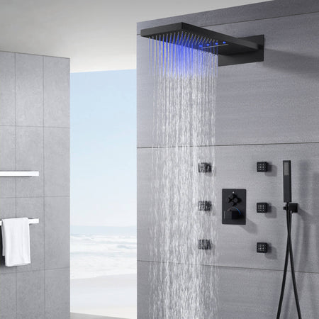 22-Inch Matte Black 4-Way Thermostatic Shower System with Rainfall, Waterfall, and 6 Body Jets