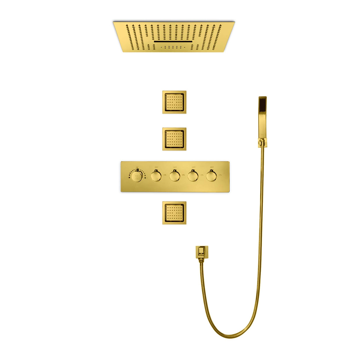 Polished Gold 16inch 64 LED colors Flushed in Bluetooth Music 4 Way Thermostatic Shower Faucet with 4 Inch Body Jet