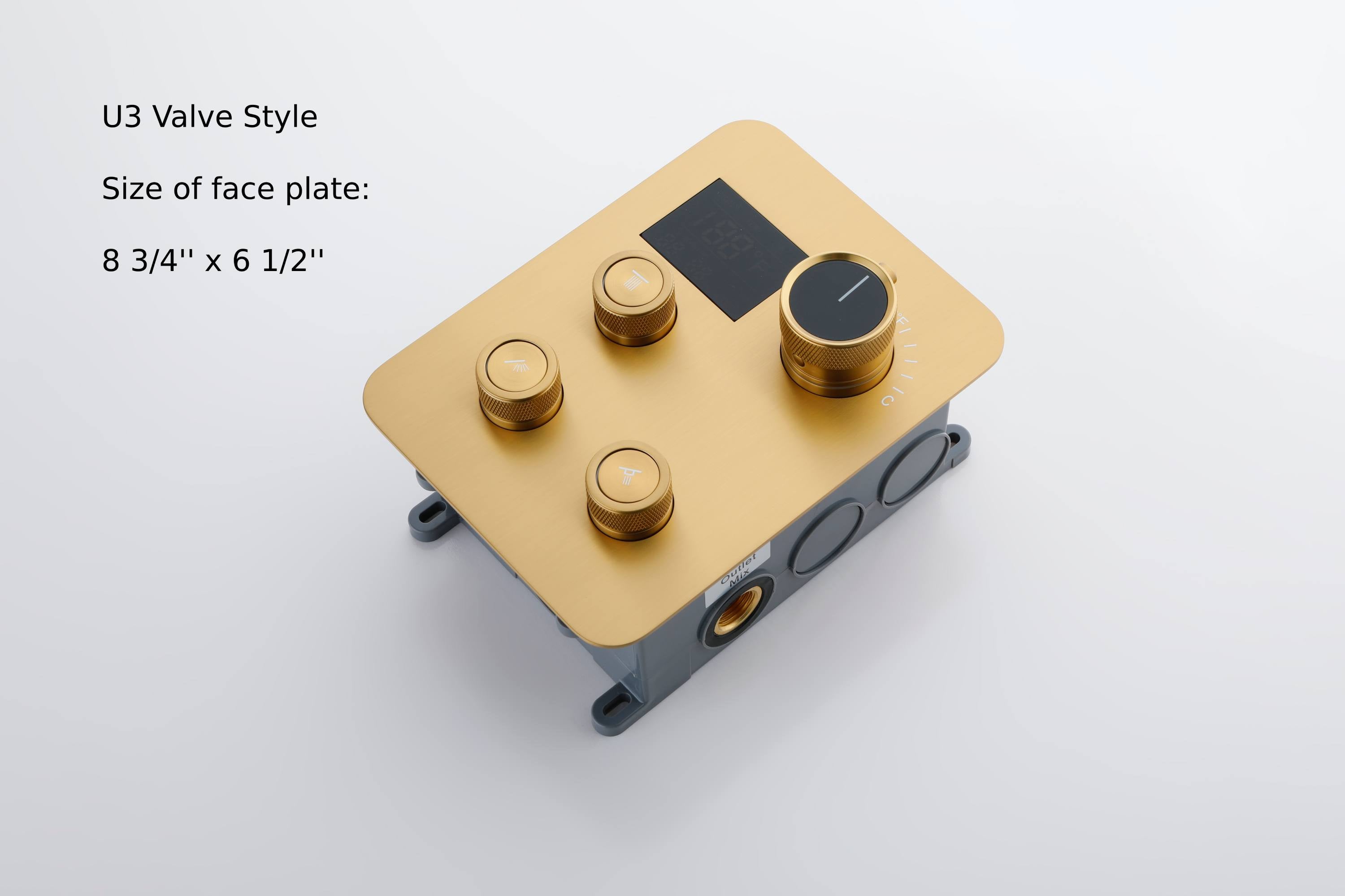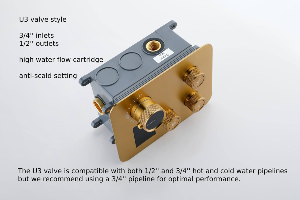 The U3 valve style features a digital display and push buttons for adjusting water flow and pressure, accommodating 1/2 inch or 3/4 inch hot and cold water pipelines, with a high water flow range of 2.5 to 7.8 GPM.